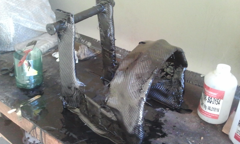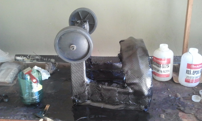 2º passo : Passe a resina/endurecedor (50%) no papelão e usando luvas “cole” algumas camadas do tecido de fibra de carbono por todo papelão;