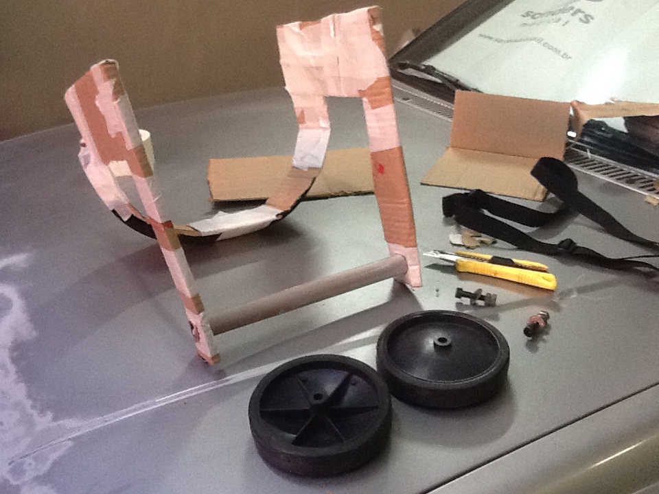 Uma “fita de mochila”, resina epóxi, fibra de carbono, rodinhas plásticas, carpete, porcas/parafusos, uma rede com ganchos e um pedaço de cano de PVC.