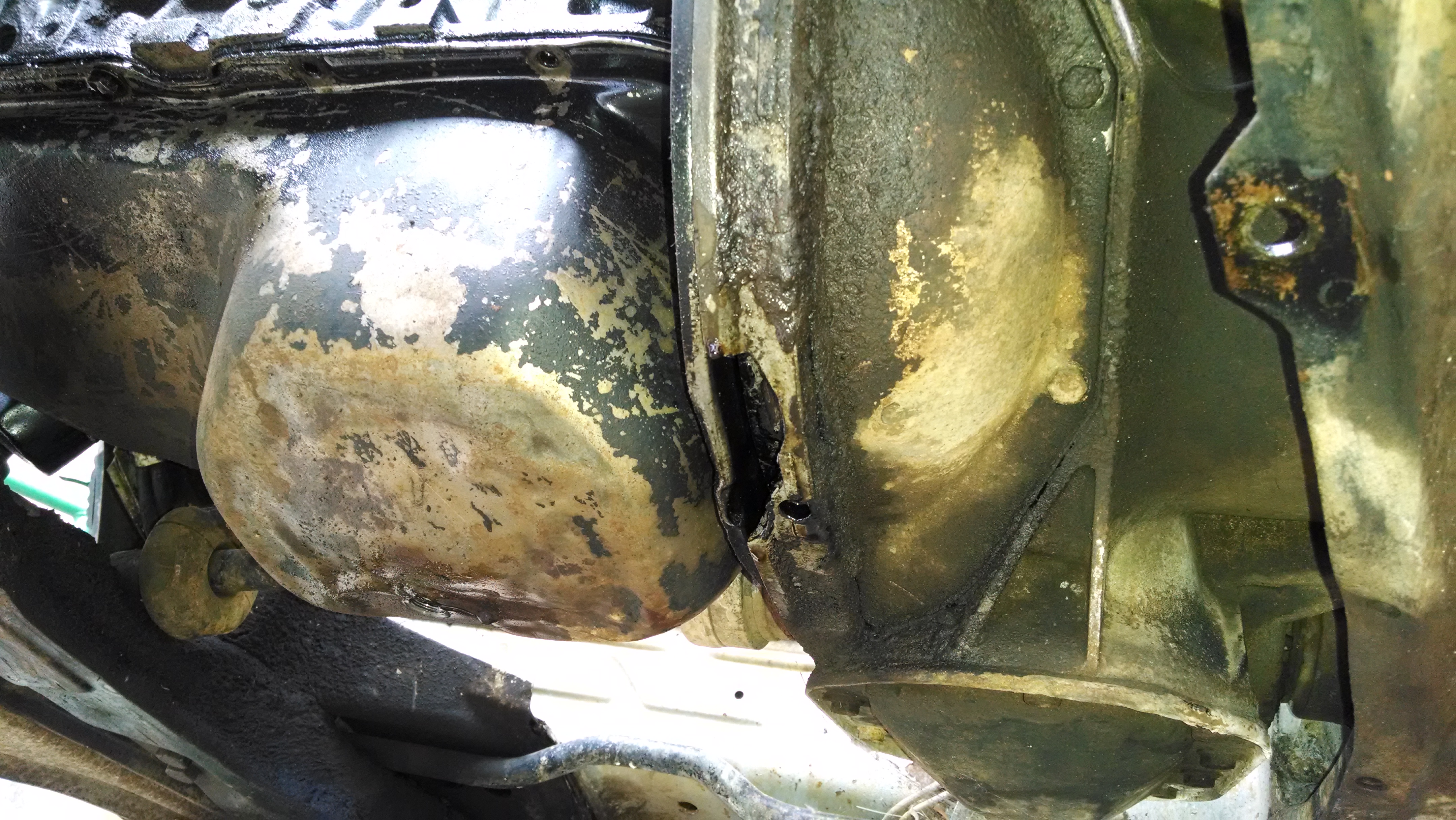 Motor bastante carbonizado, principalmente por ser álcool, mas o pior são as “surpresas”, a carcaça da transmissão F16 faltando um pedaço!!!! O cárter muito amassado e dentro havia muita borra de óleo e uma crosta enorme.