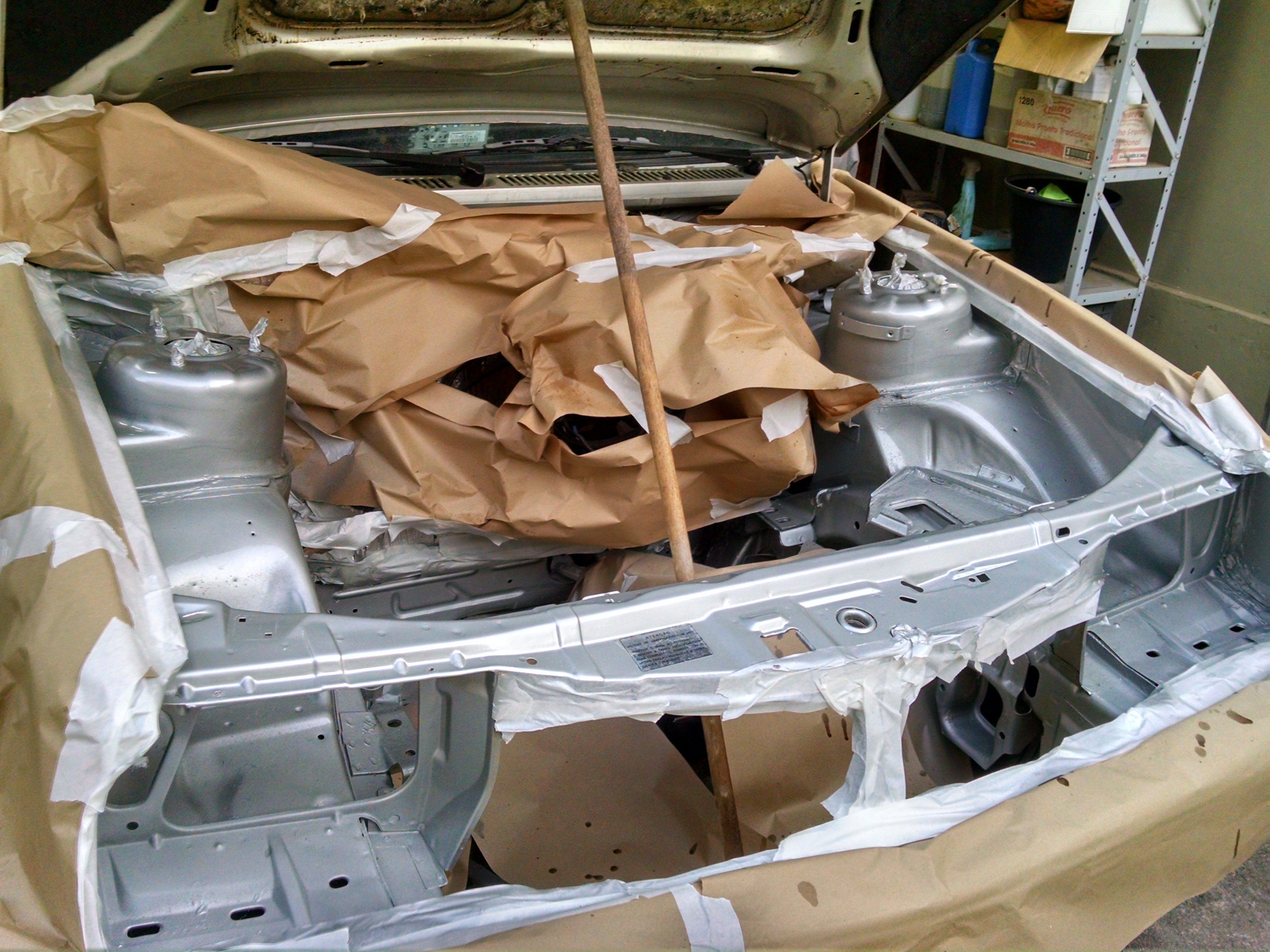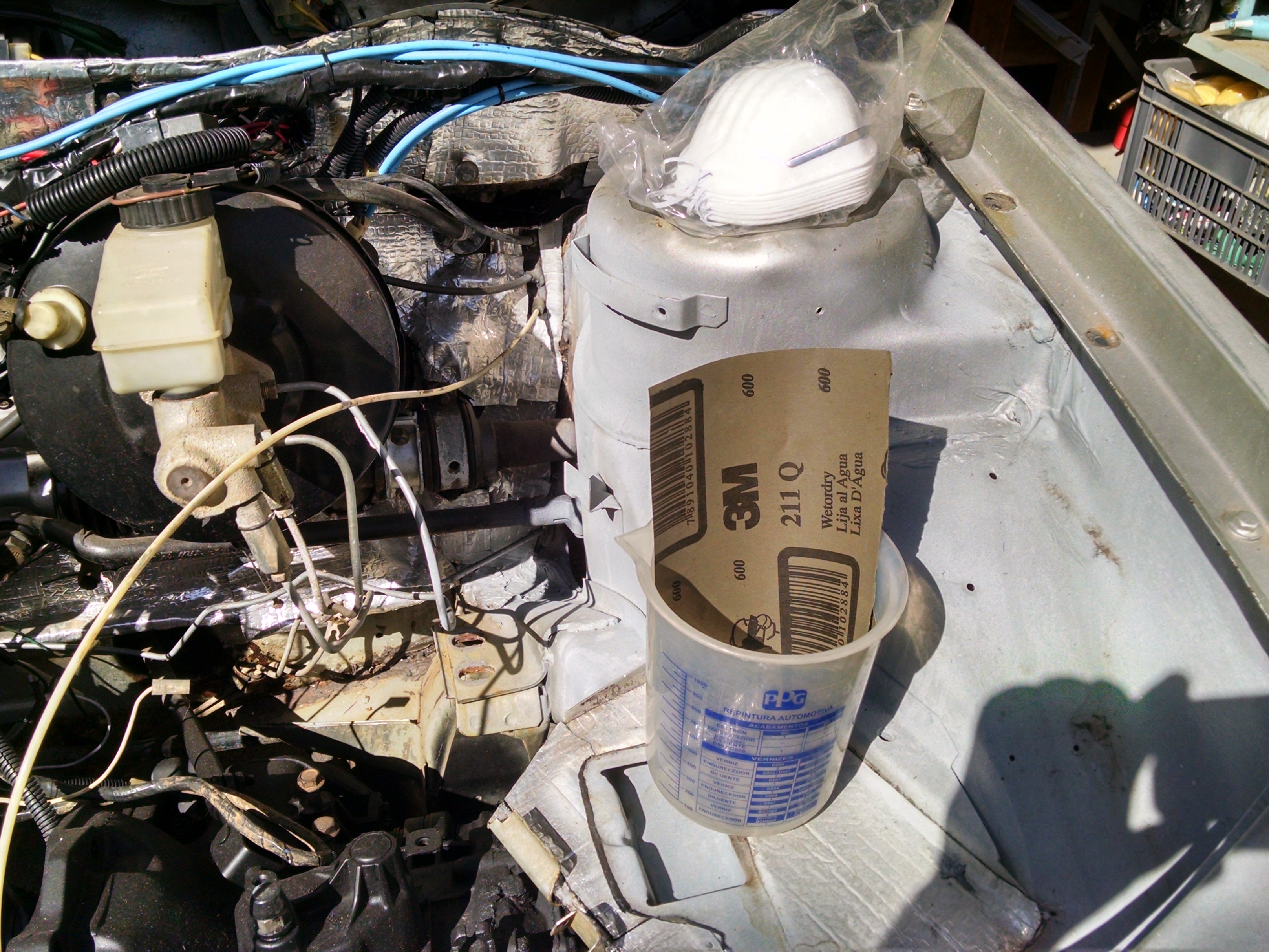 O primeiro passo foi lavar e desengraxar muito bem todo o compartimento do motor, depois consertar a funilaria, na verdade as trincas na massa KPO, a lataria não tinha nenhum problema, em seguida passei o primer.