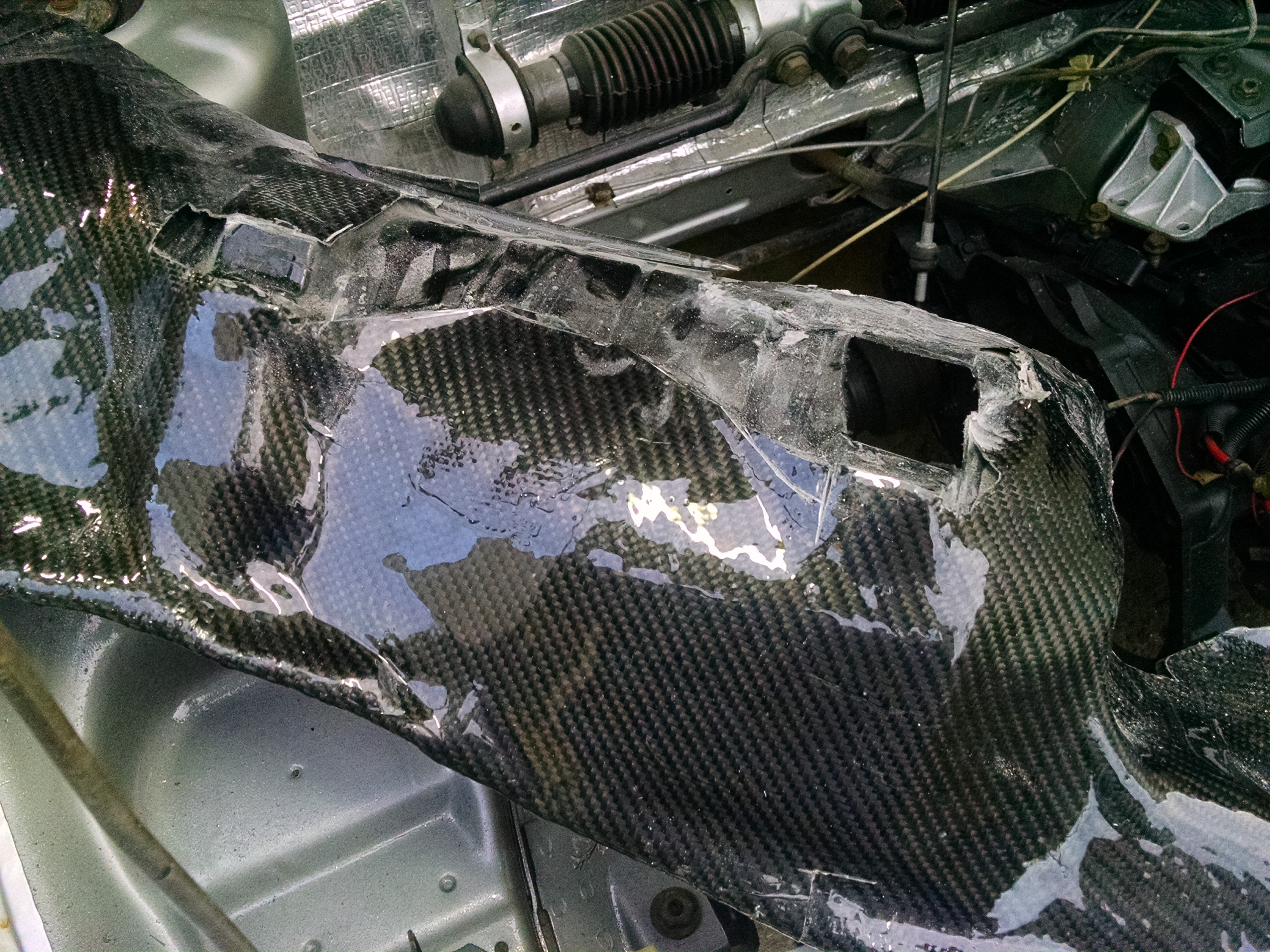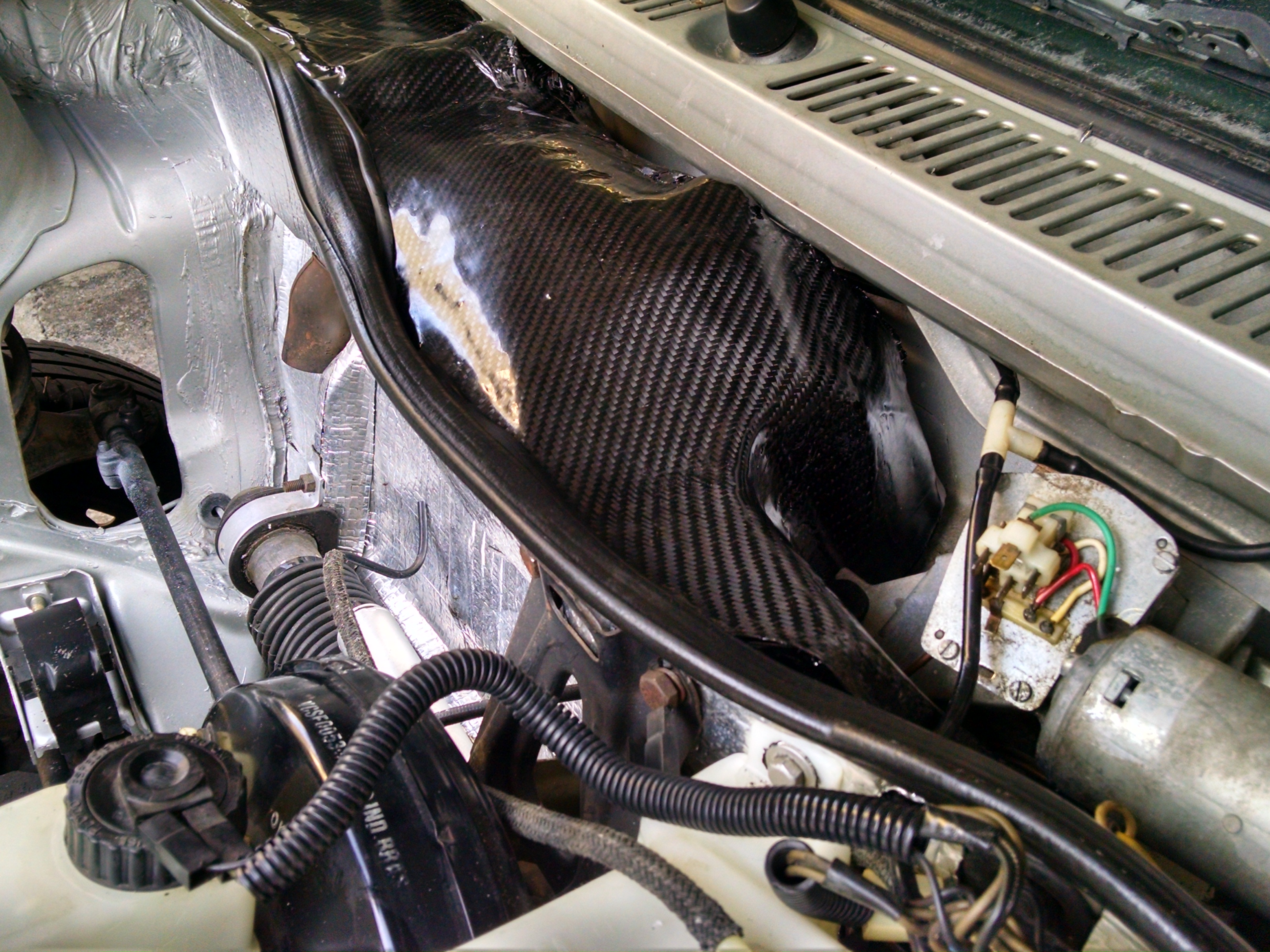 O quinto passo foi ajustar a peça no carro. Neste ponto que descobri porque a GM fez uma capa plástica fina, na montagem é necessário entortar e dobrar a peça para que ela encaixe corretamente. Com a fibra de carbono e a resina a peça ficou bastante rígida então tive que retrabalhar e mudar o formato (seria muita sorte tudo dar certo na primeira tentativa).
