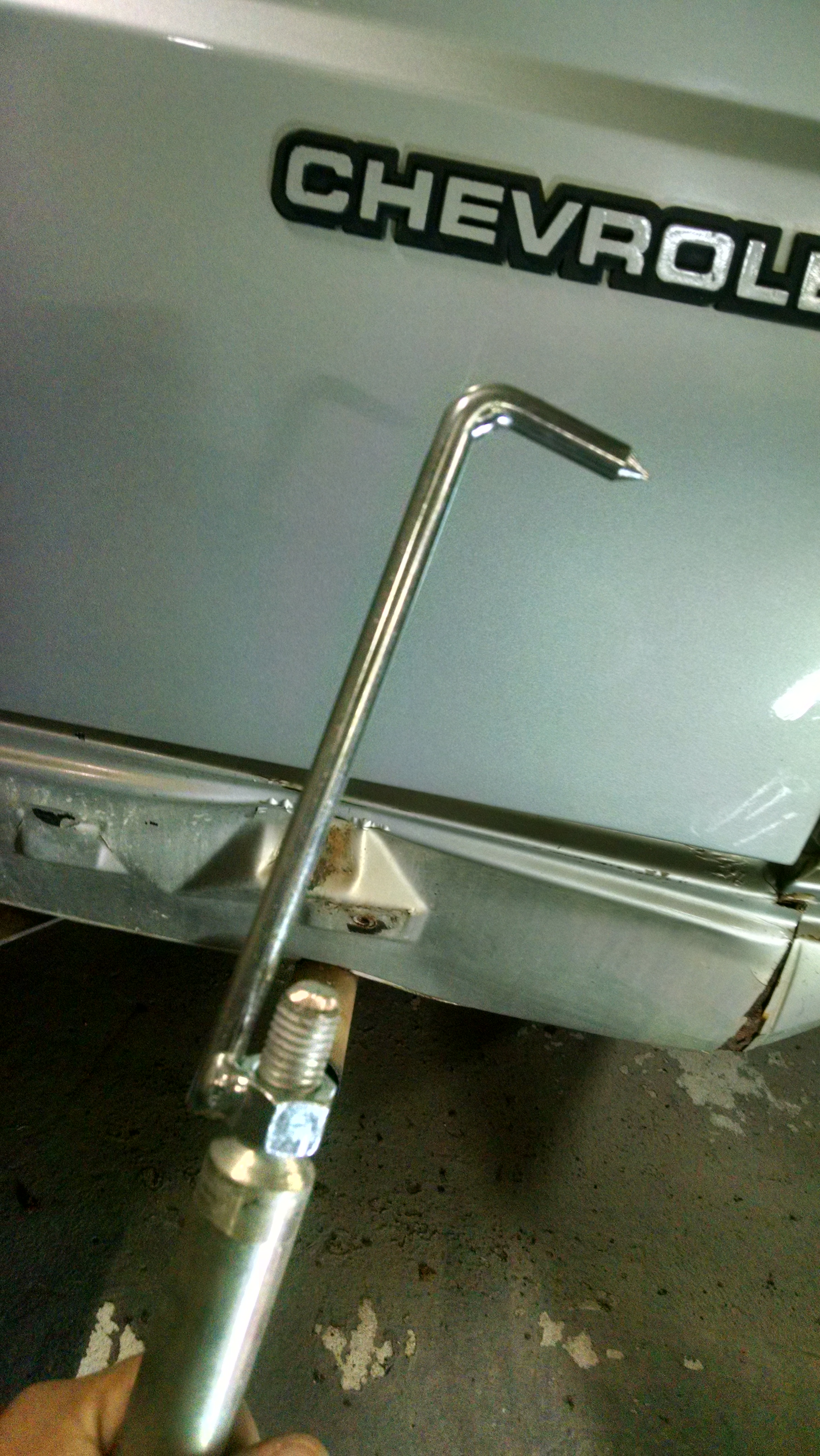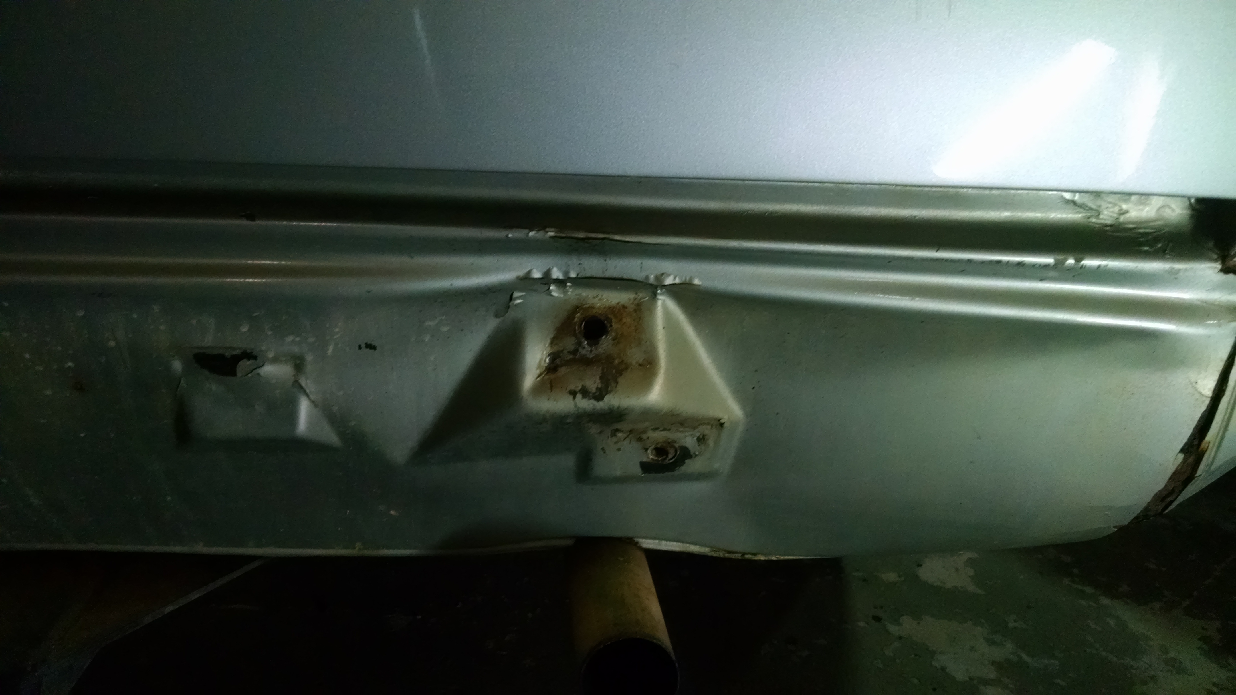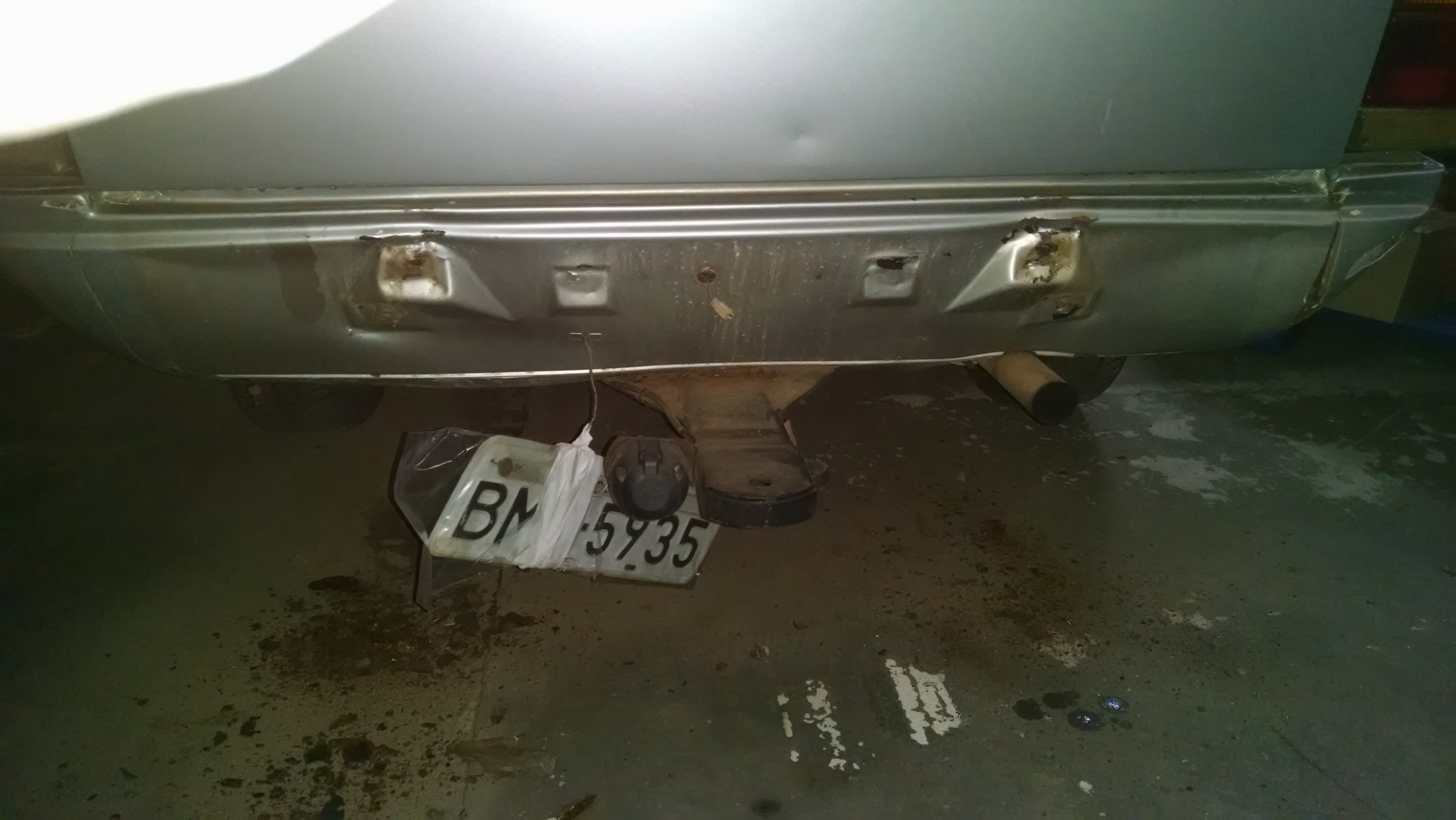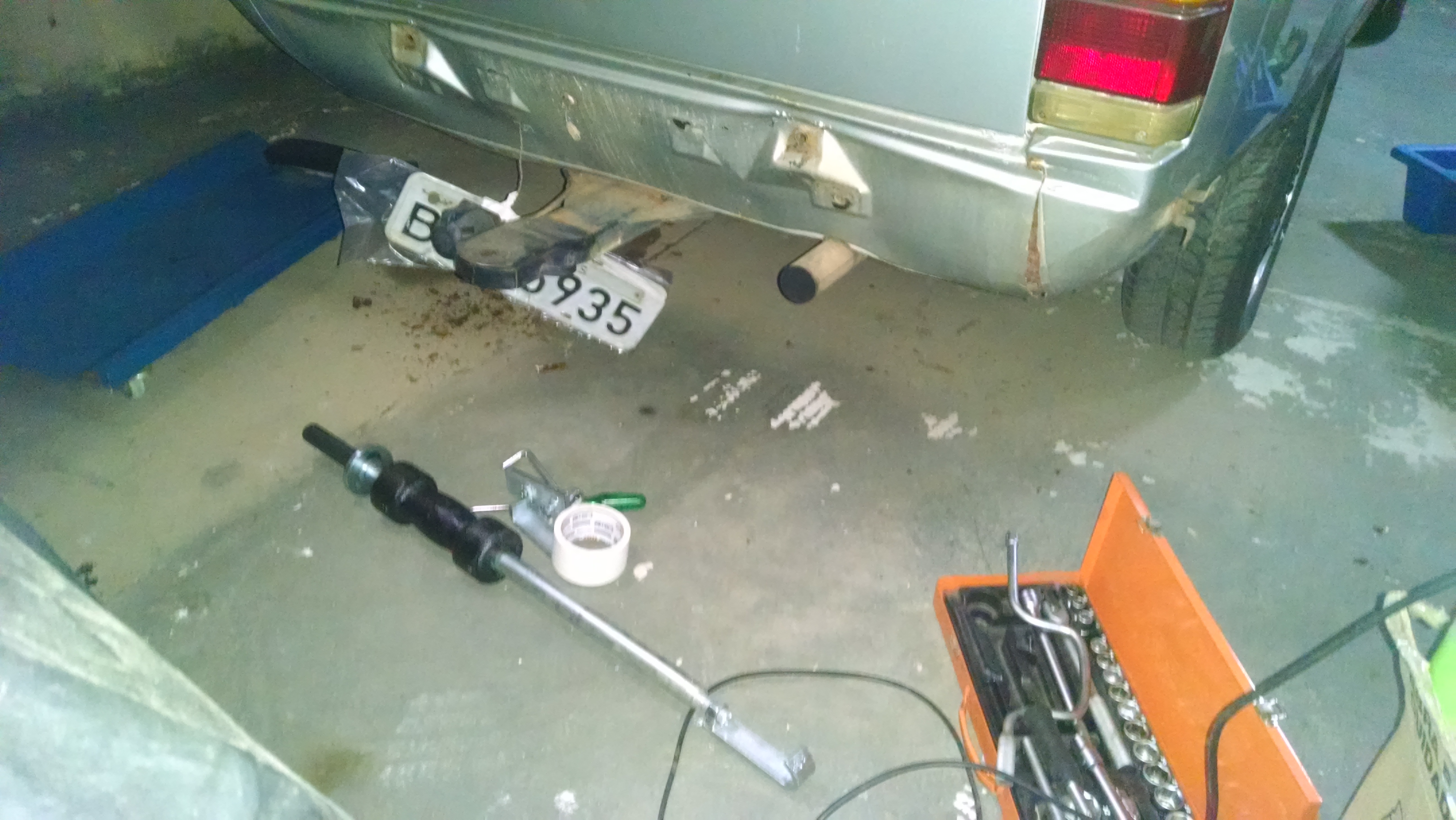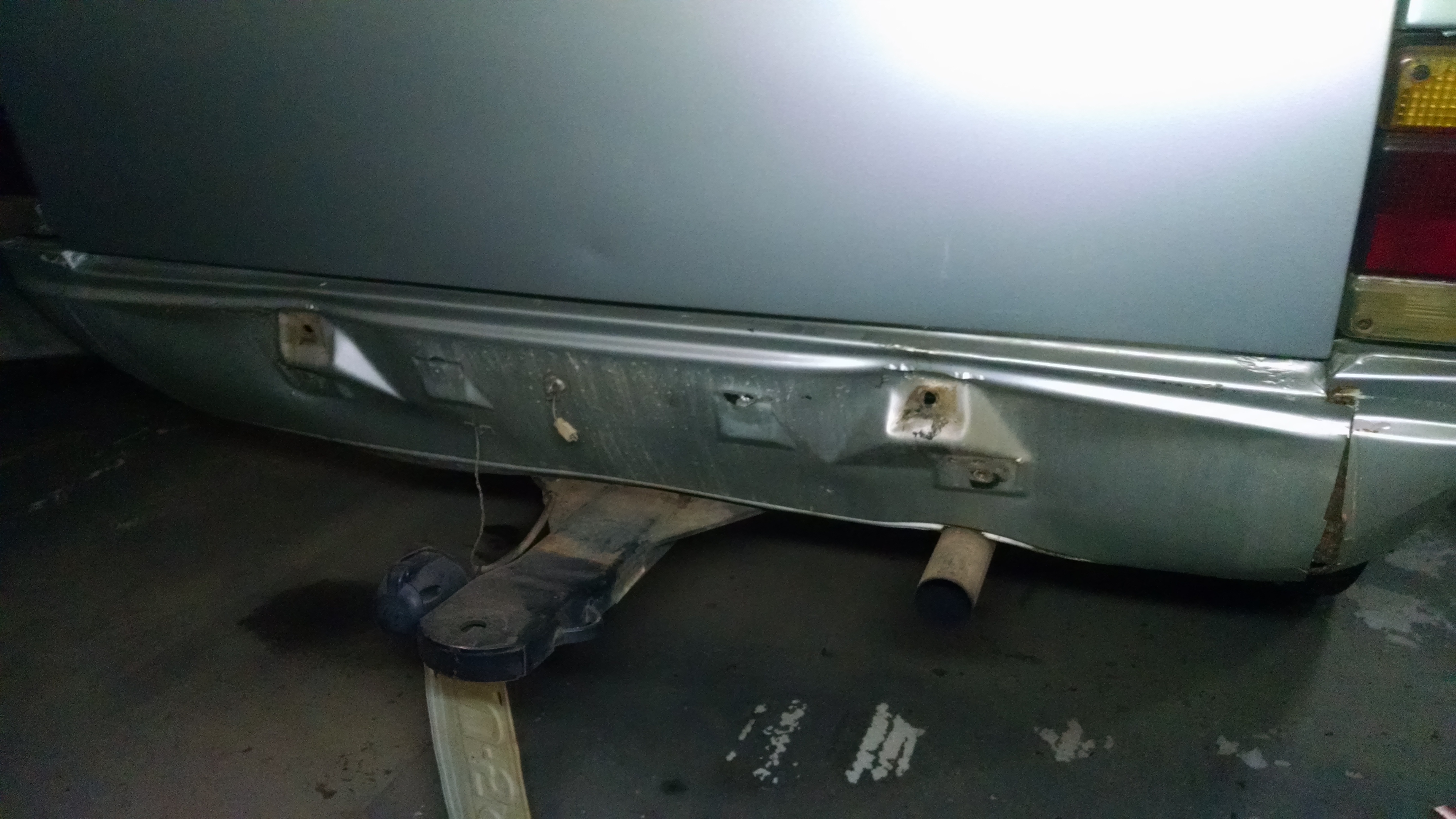 O primeiro passo foi tentar desamassar o carro, usando a marreta dinâmica comecei a desamassar o painel traseiro (já que não consegui um novo para comprar, mas ainda tenho esperança de encontrar um novo por um preço justo), primeiro prendi no parachoque amassado e usando a marreta tentei puxar de volta o painel (mas esqueci de tirar fotos), veja nas fotos que após tirar o parachoque usei a marreta nos furos para voltar um pouco mais o painel.