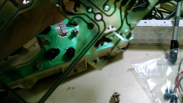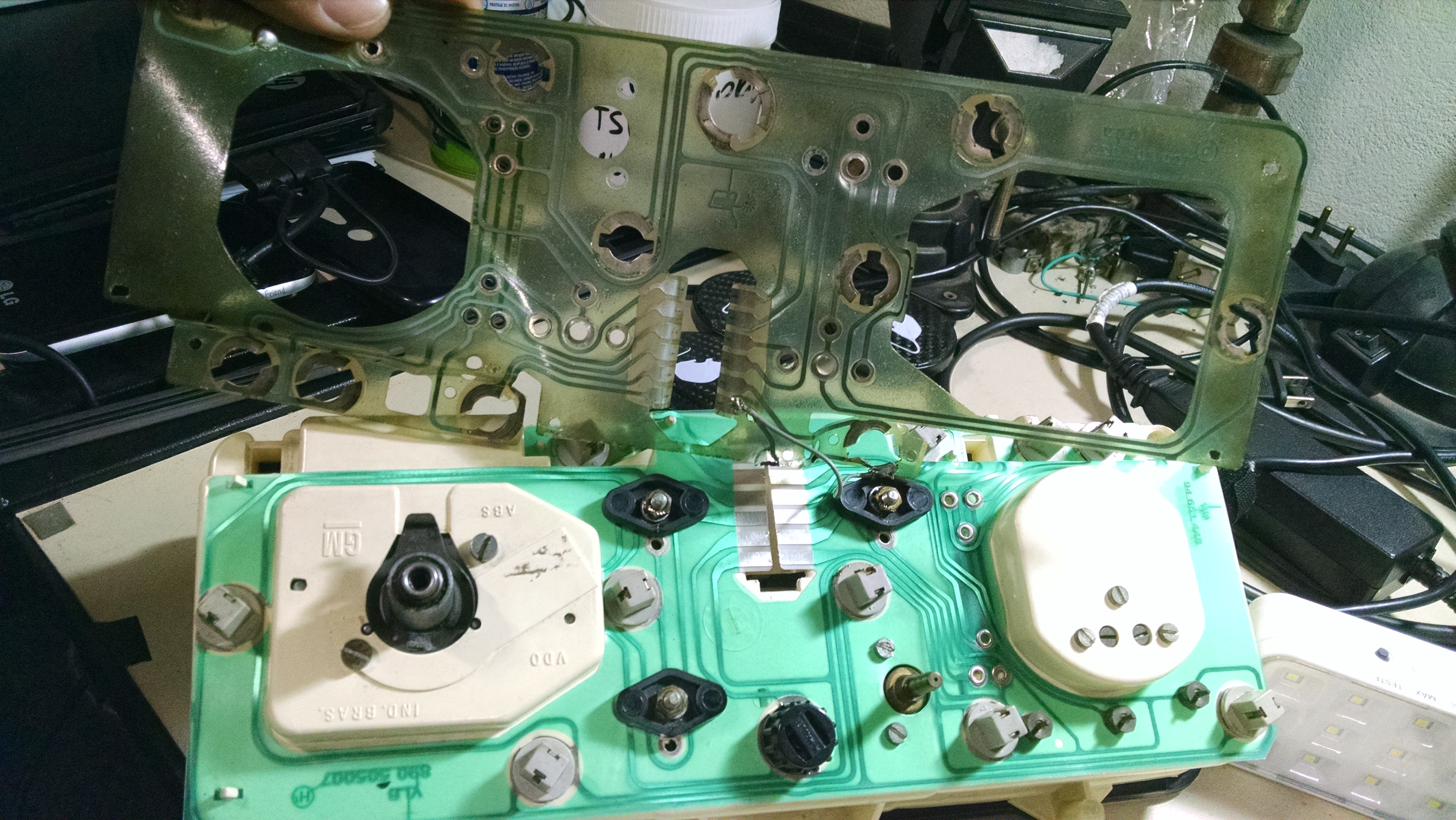 Com exceção do velocímetro, montei os instrumentos que eram do S/R McQueen (desconfio que o original do 87 estava enroscando e fazendo o cabo quebrar), que estavam menos desbotados que os originais dele e sei que estão funcionando. Também troquei o circuito do painel por um novo, já que o antigo tinha alguns “jumps”, e lâmpadas queimadas.