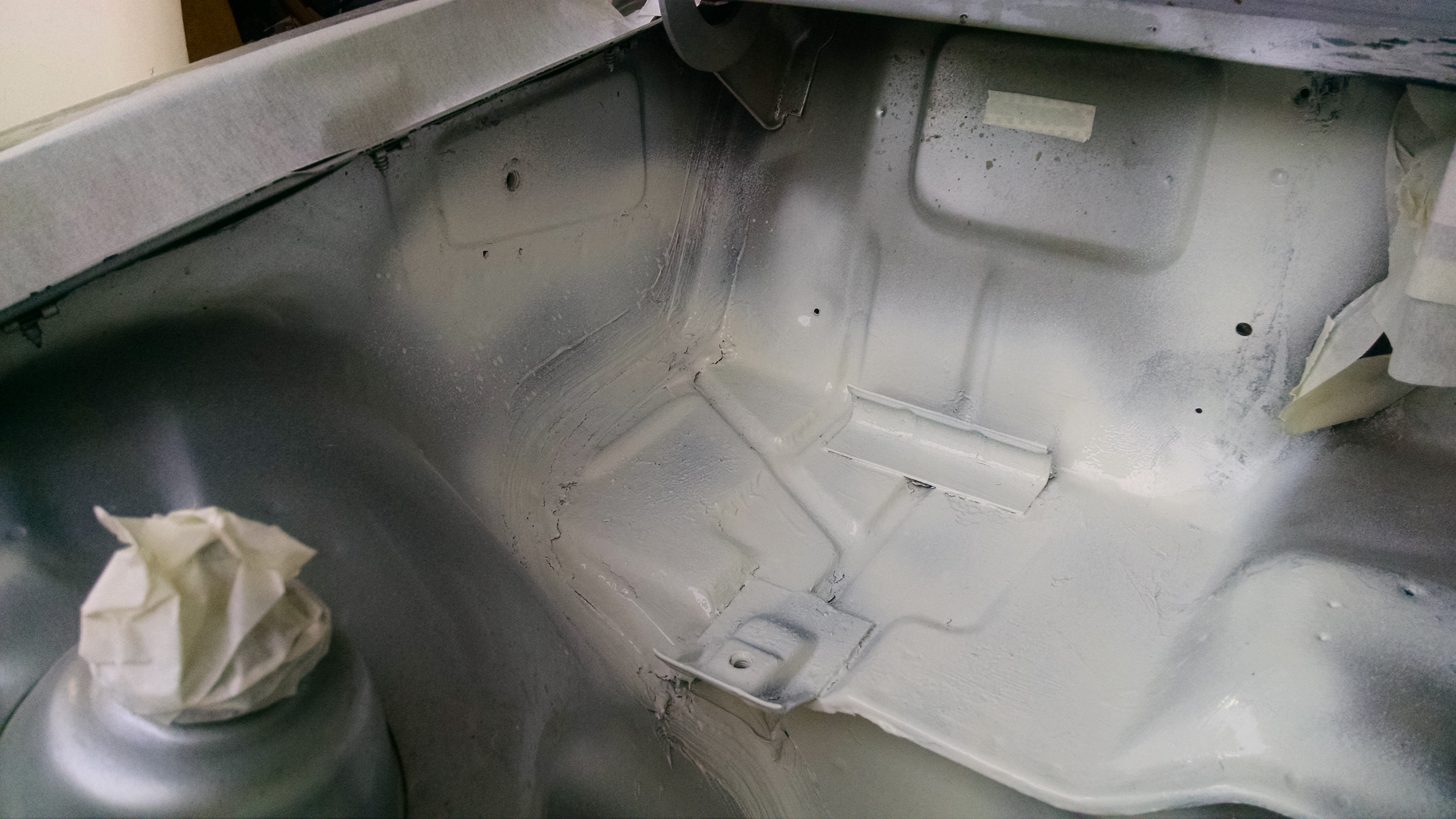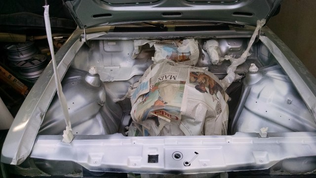 Comecei lavando e desmontando tudo que pude no compartimento do motor, em seguida fiz uma leve funilaria consertando a massa de vedação, lixei a pintura antiga, isolei as partes que não queria e pronto.