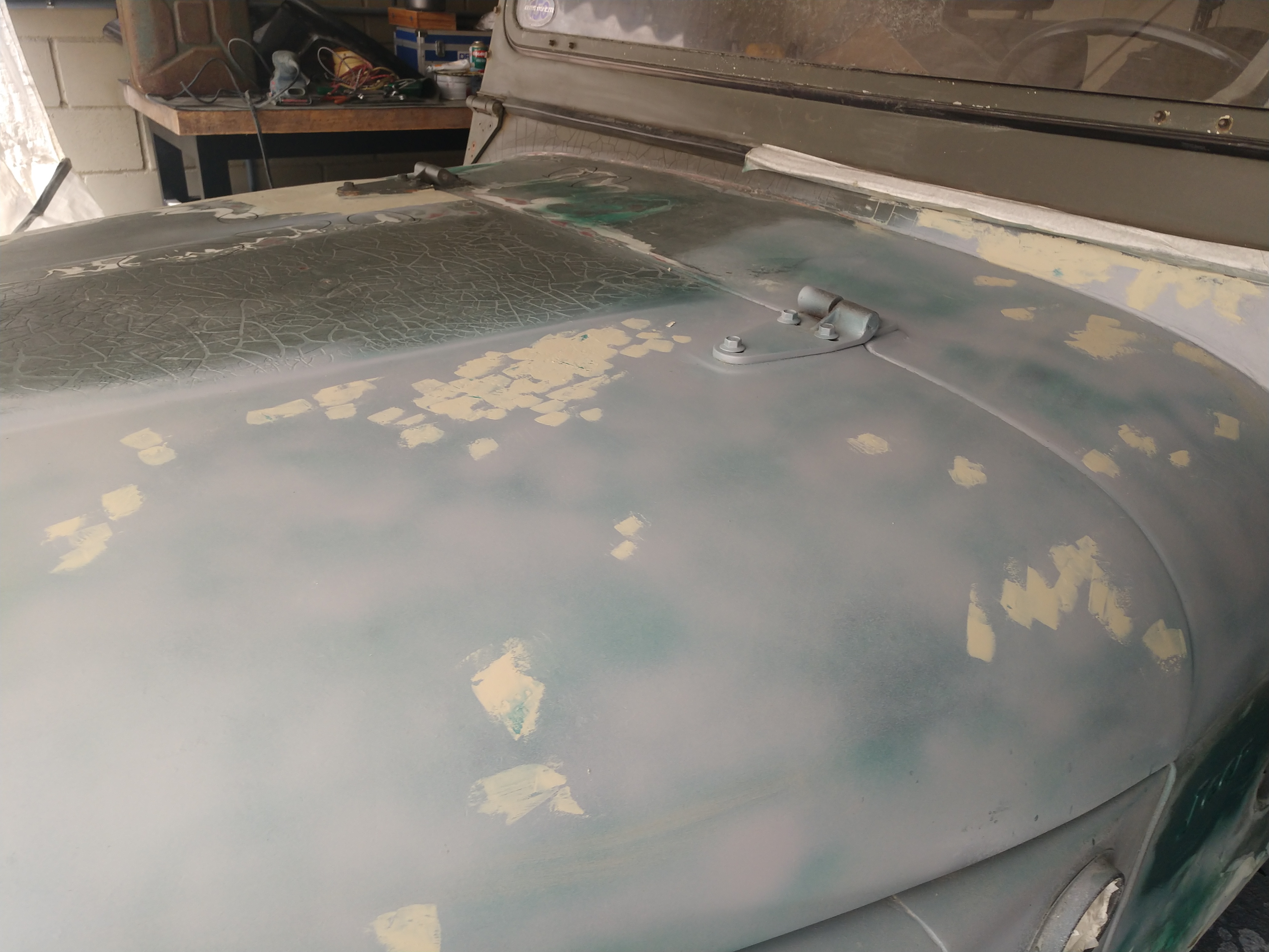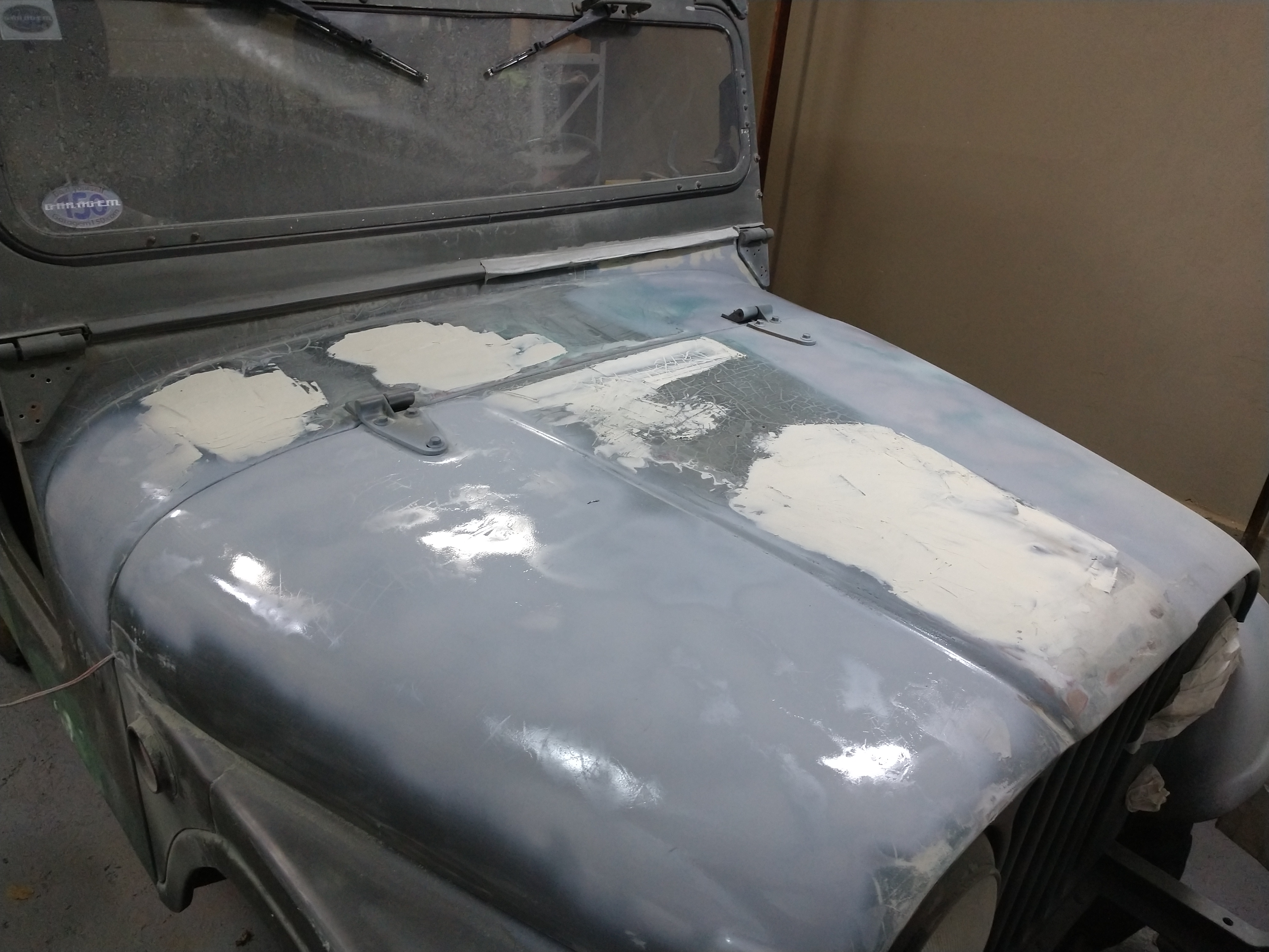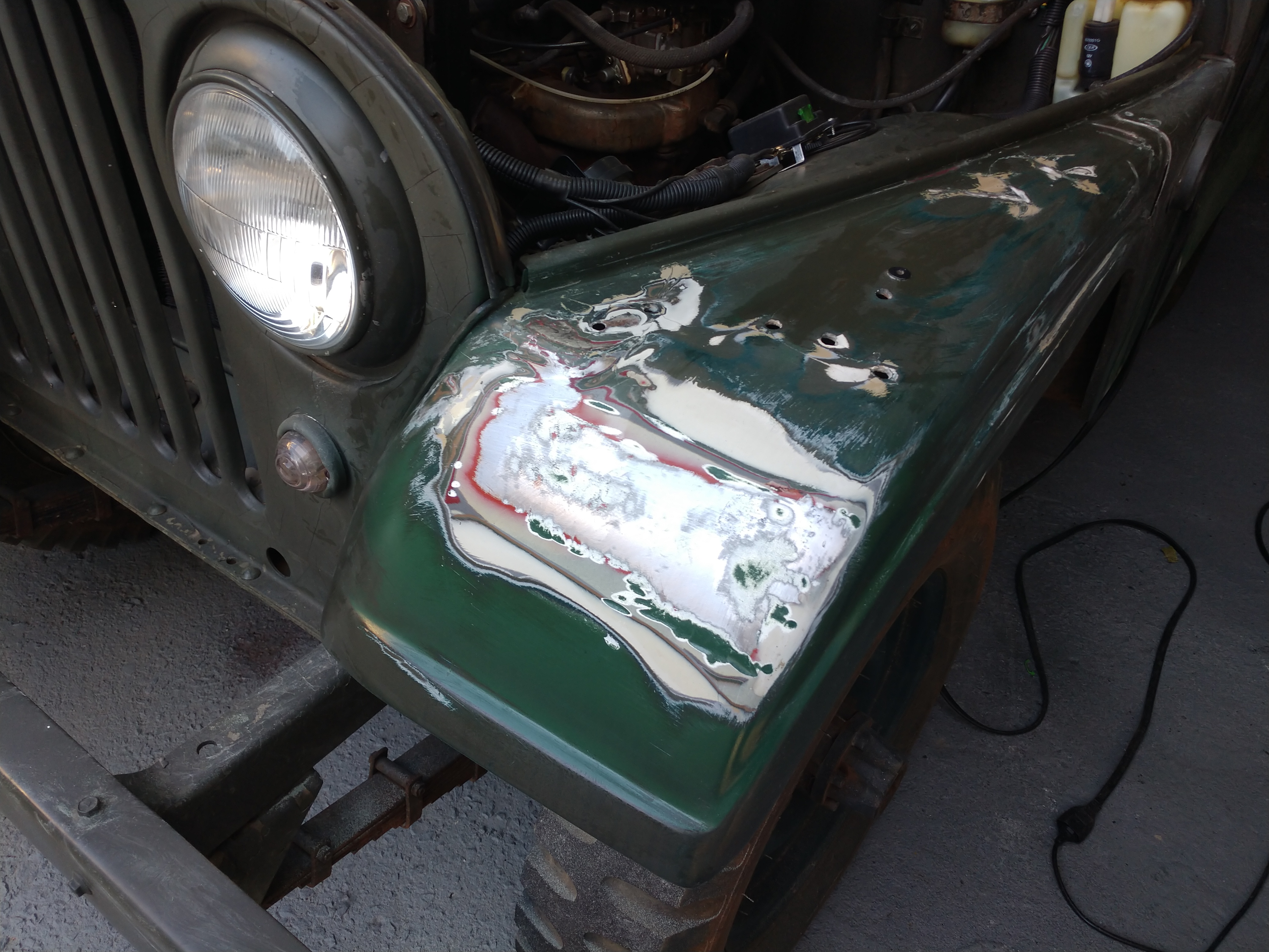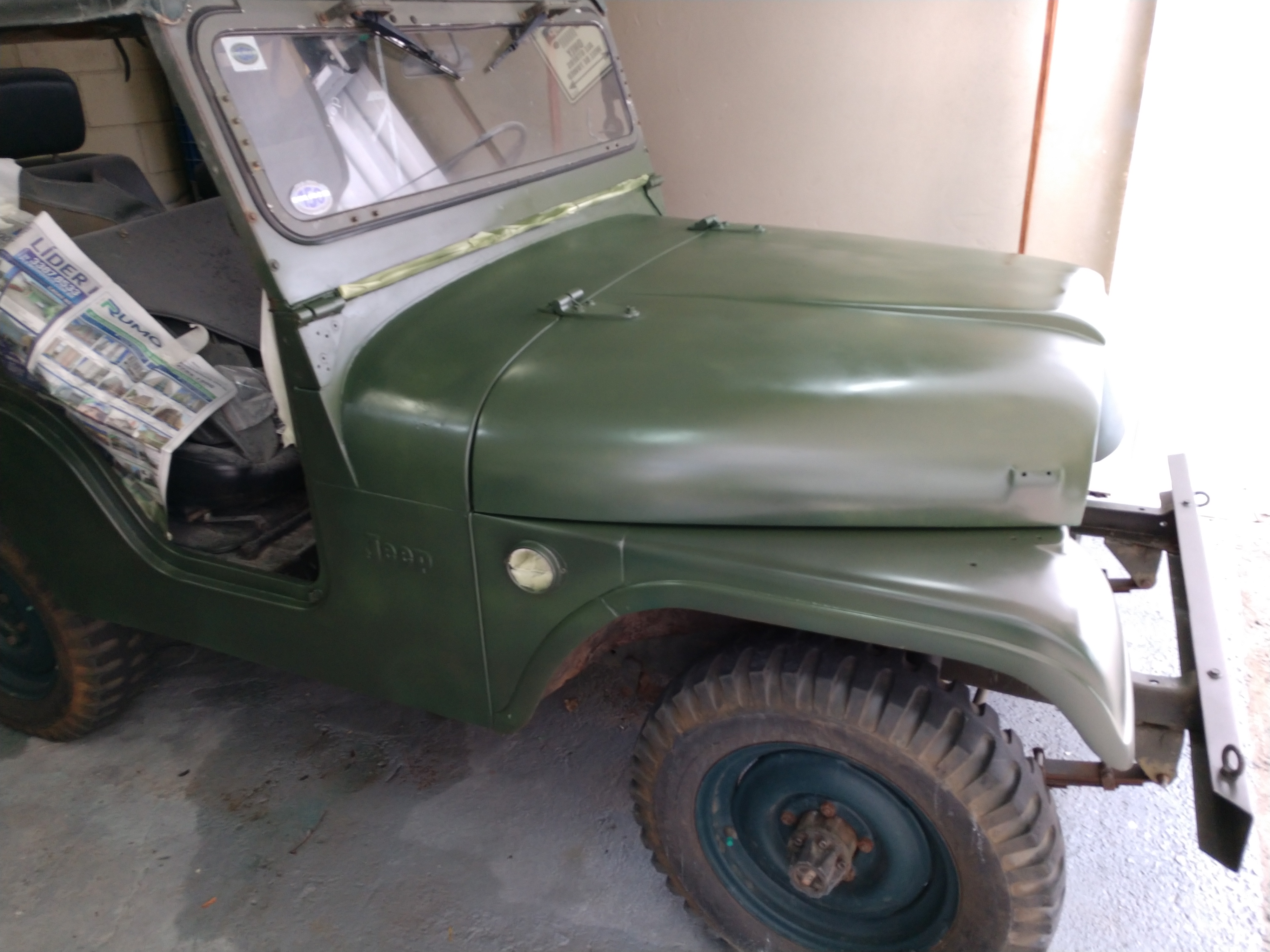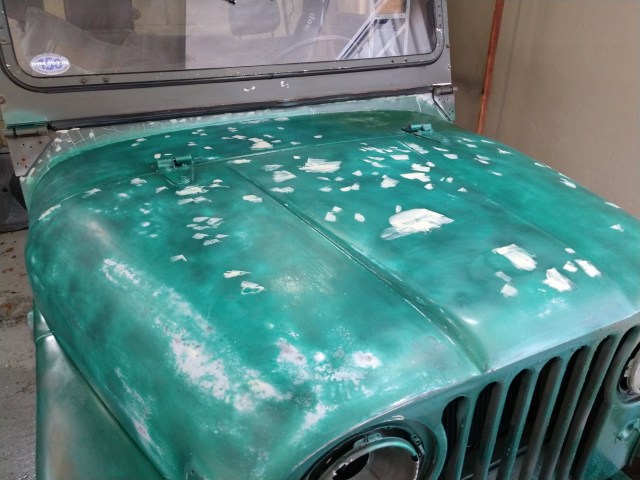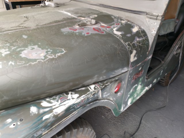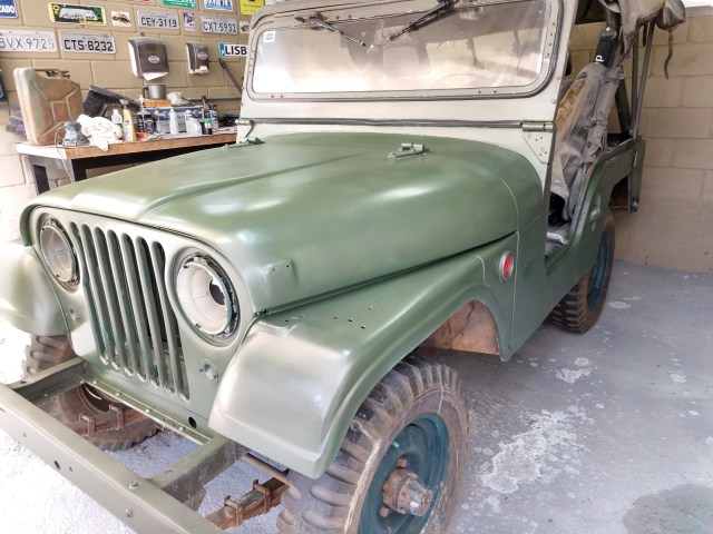 E após eu cansar de lixar (foram muitas e muitas horas) chegou um momento que decidi que já estava bom, afinal ele é um Jeep de 47 anos e eu só queria melhorar um pouco o visual dele. Então pintei com uma tinta “cor verde em promoção”, apenas para poder ver e tirar mais alguns defeitos.