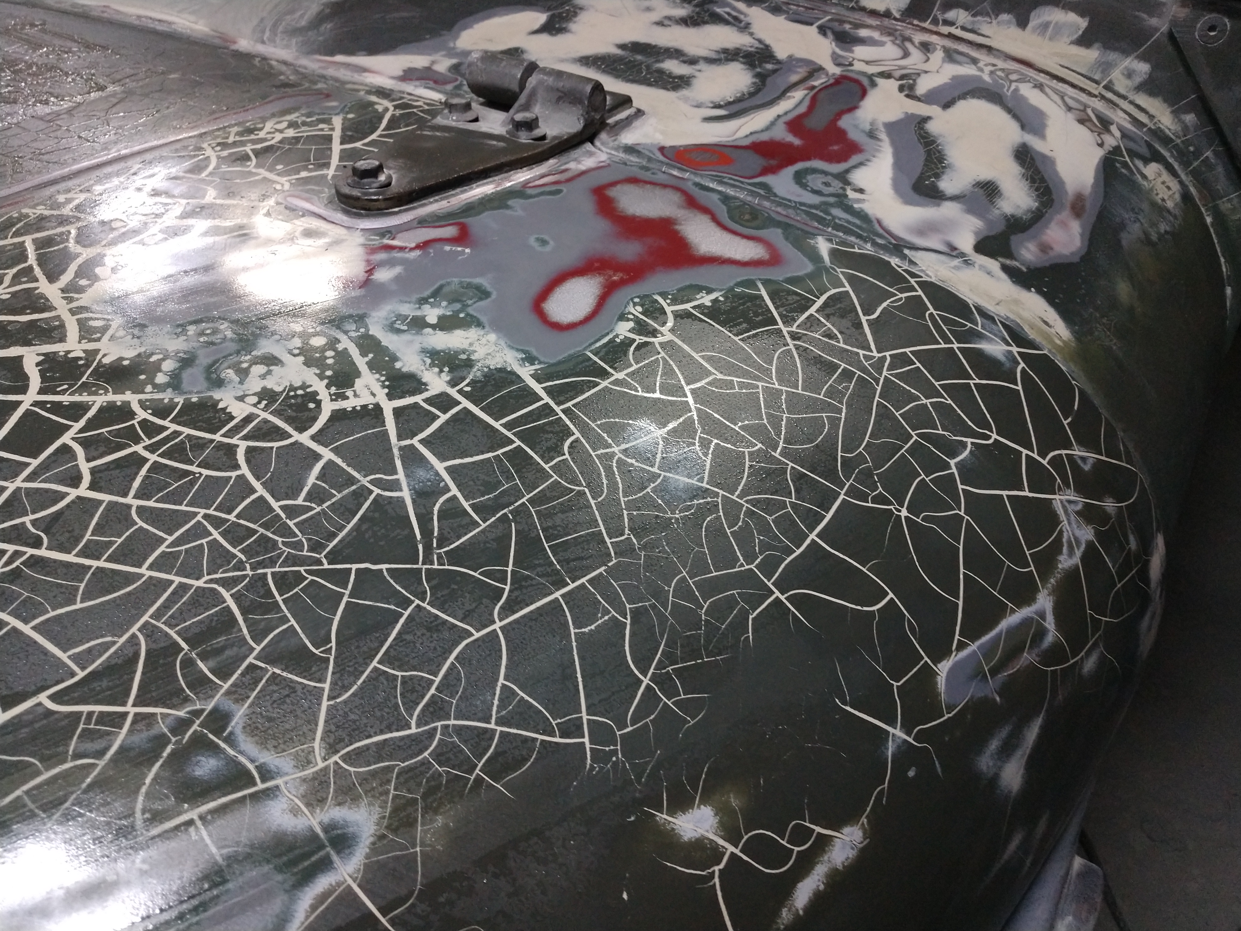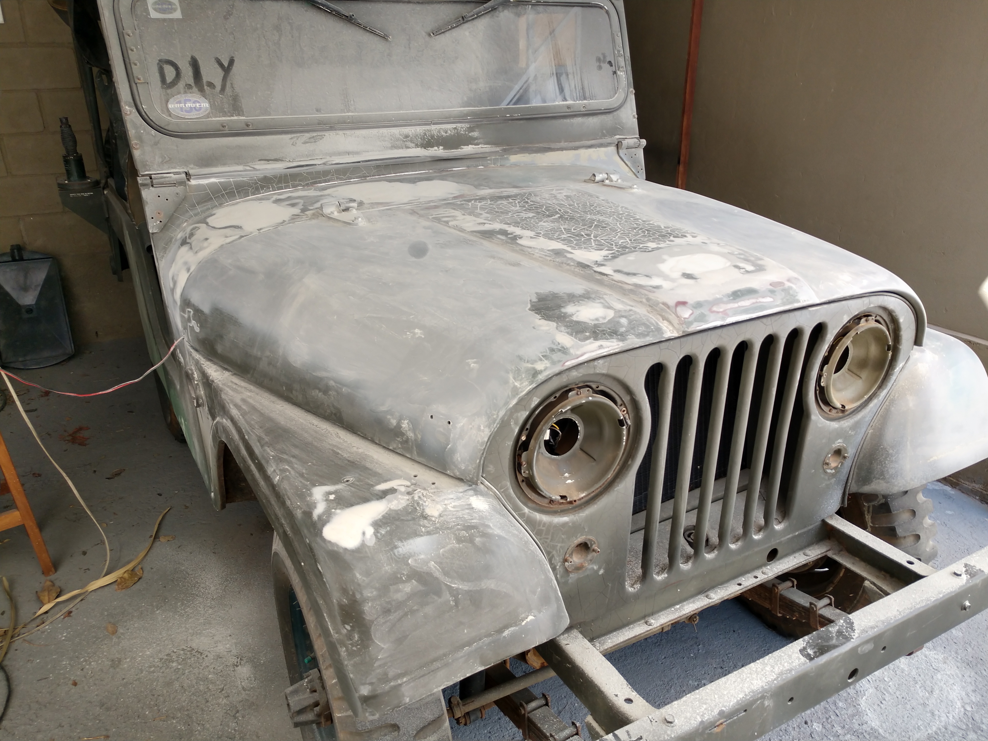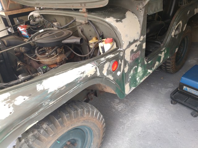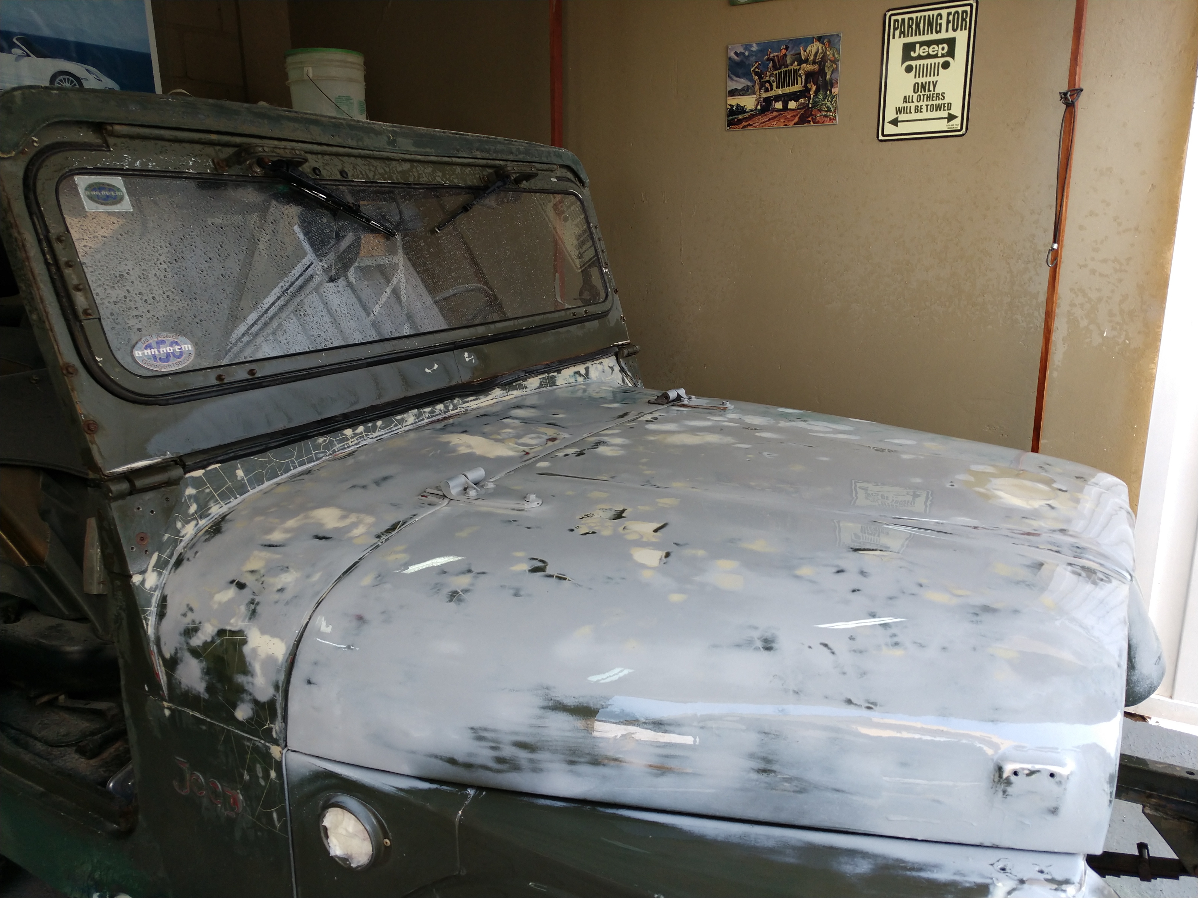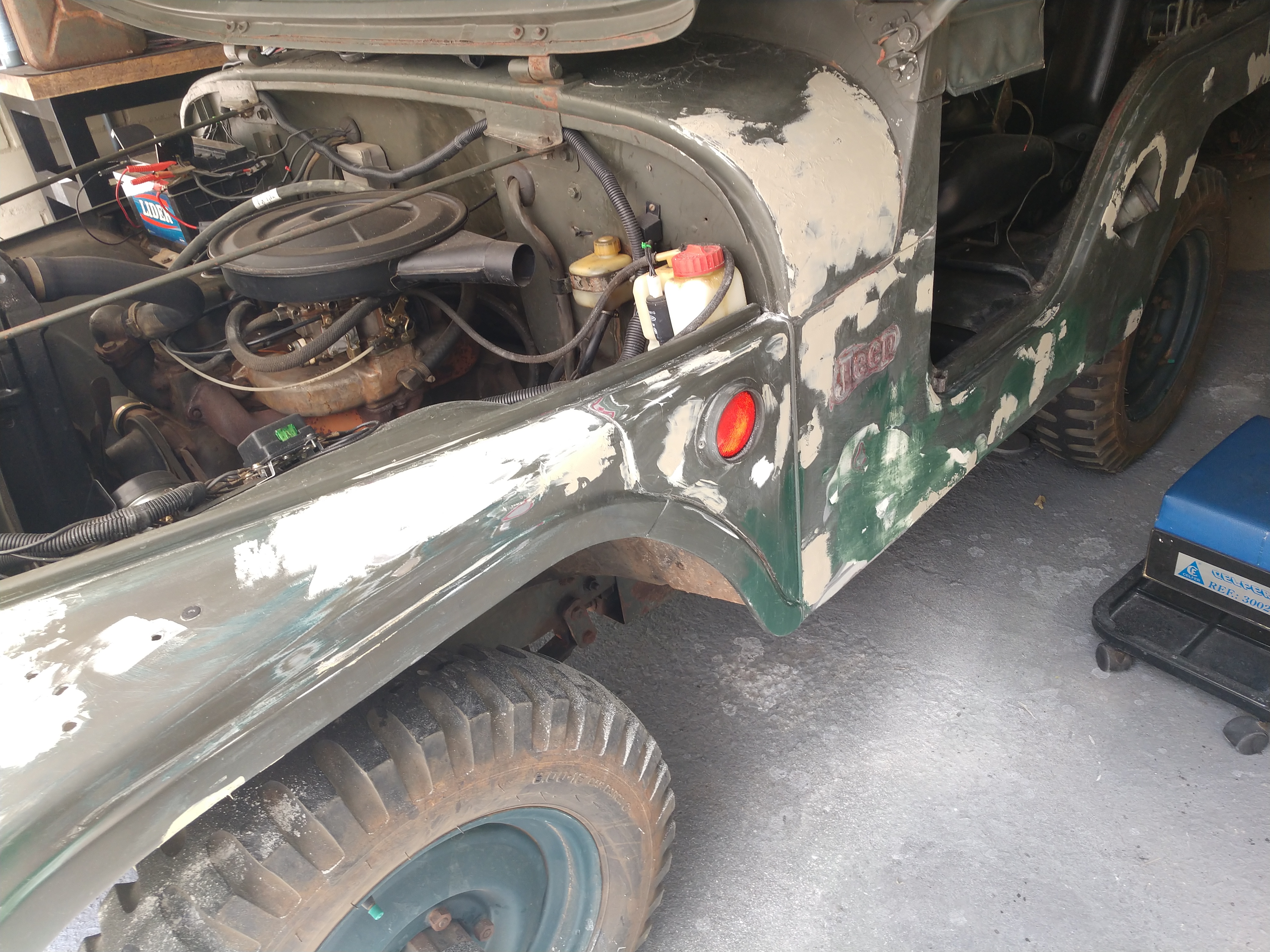 E após eu cansar de lixar (foram muitas e muitas horas) chegou um momento que decidi que já estava bom, afinal ele é um Jeep de 47 anos e eu só queria melhorar um pouco o visual dele. Então pintei com uma tinta “cor verde em promoção”, apenas para poder ver e tirar mais alguns defeitos.