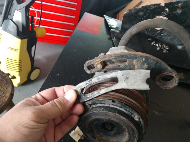 Inicialmente achei que era apenas a mangueira de baixa qualidade, mas quando estacionei o Monza nas rampas da Garagem 150, tirei a proteção das polias e o protetor do carter do motor vi que o esticador da correia do compressor também estava quebrado, com isso o compressor “caiu” esticando e quebrando a mangueira. Ou seja o kit inteiro é de baixa qualidade, durou apenas 1 ano….
