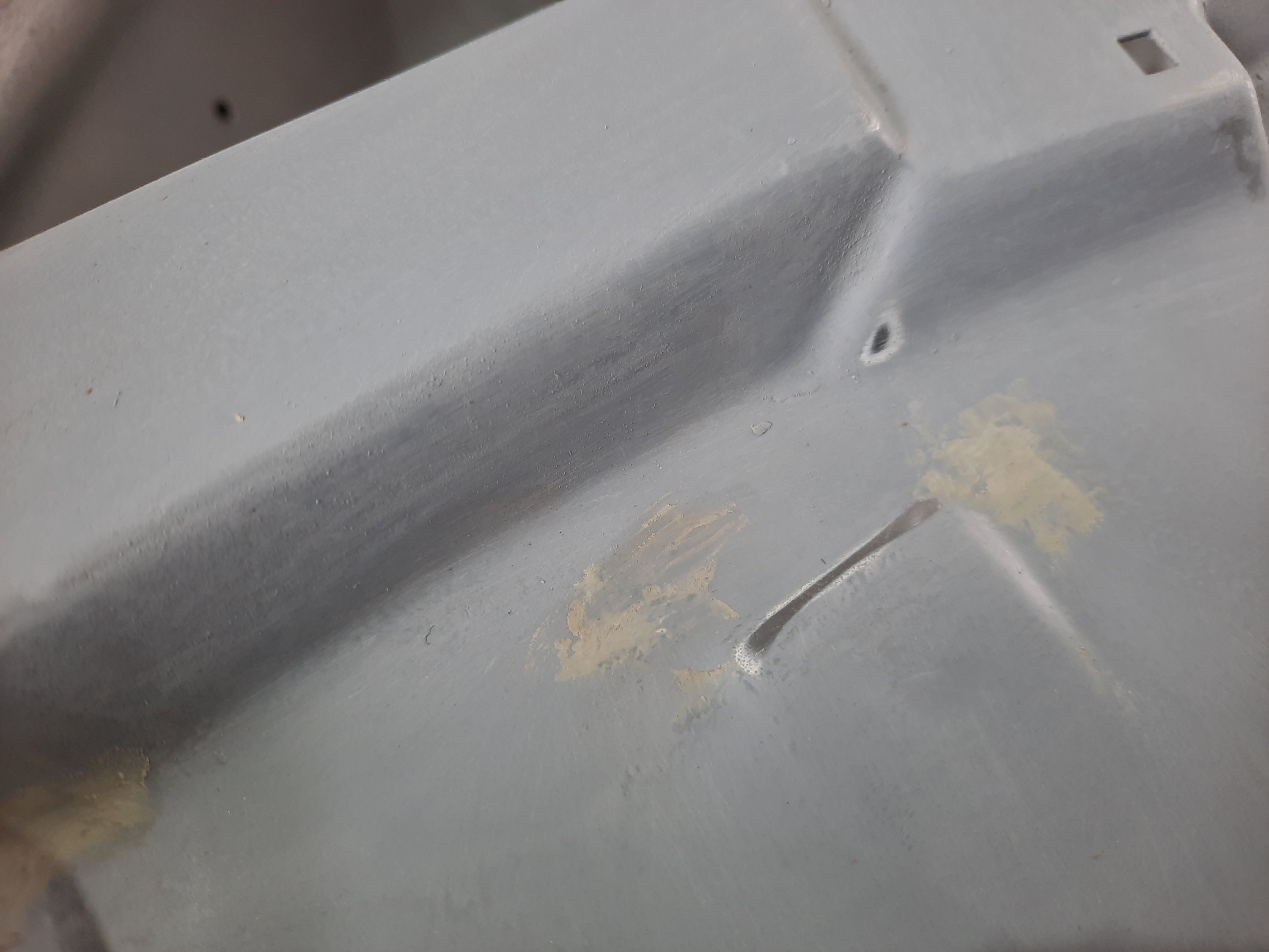 Terceiro passo: Refiz o Kpo onde estava trincado e acertei alguns pontos com massa rápida. Também passei primer 2 vezes e voltei a lixar com as lixas 400 e depois 600 sempre usando água.