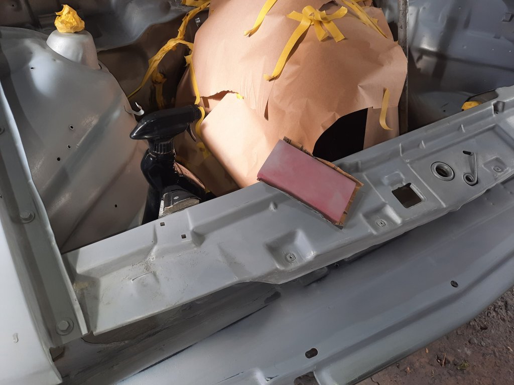 Quarto passo: Limpei tudo novamente, e “empapelei/plastifiquei(?)” As partes da Chevy que não queria pintar. Antes de pintar passei a solução desengraxante em todo compartimento do motor.
