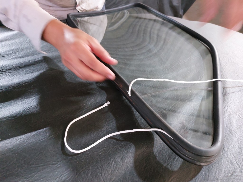 TERCEIRO PASSO: Monte a borracha no vidro e depois os frisos. Para montar os vidros no carro, passe uma cordinha, coloque o vidro na posição, enquanto uma pessoa faz força de fora para dentro outra vai puxando a cordinha.