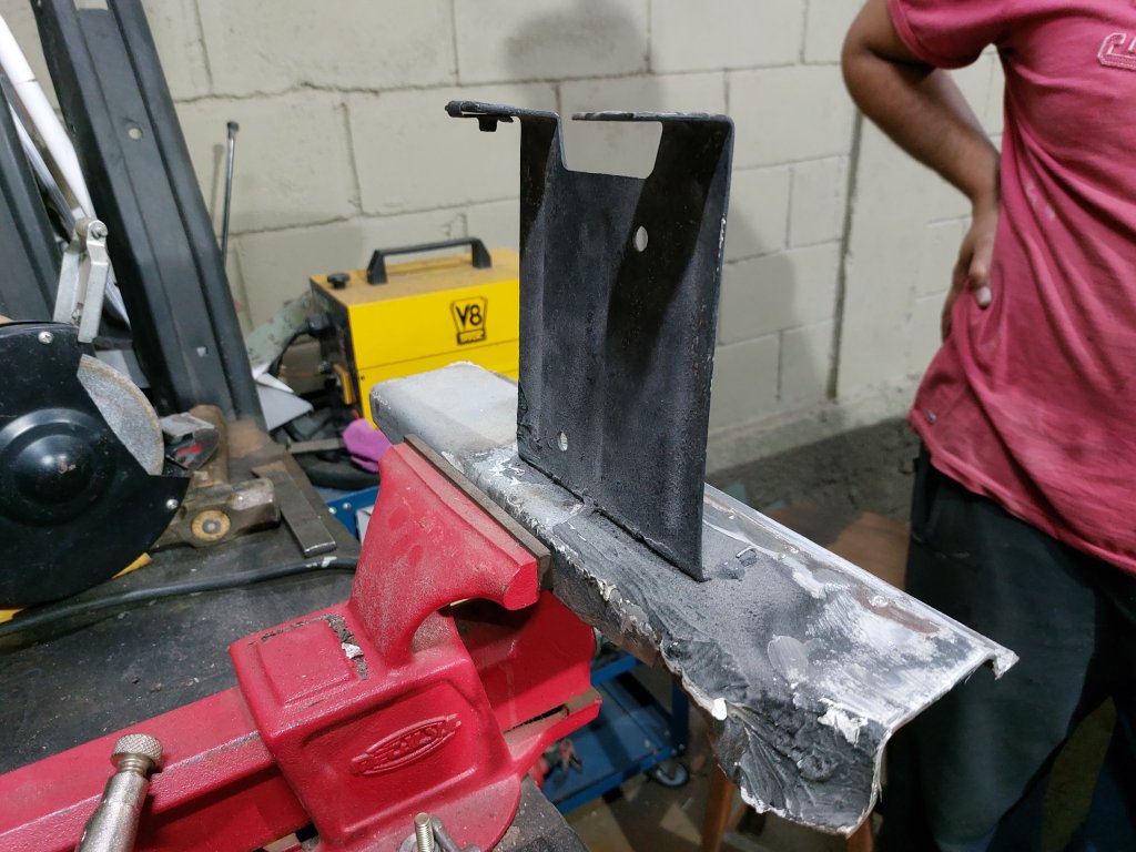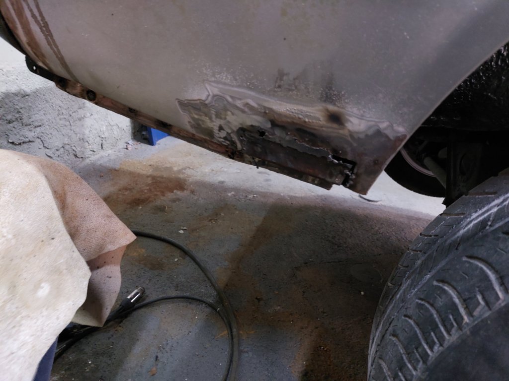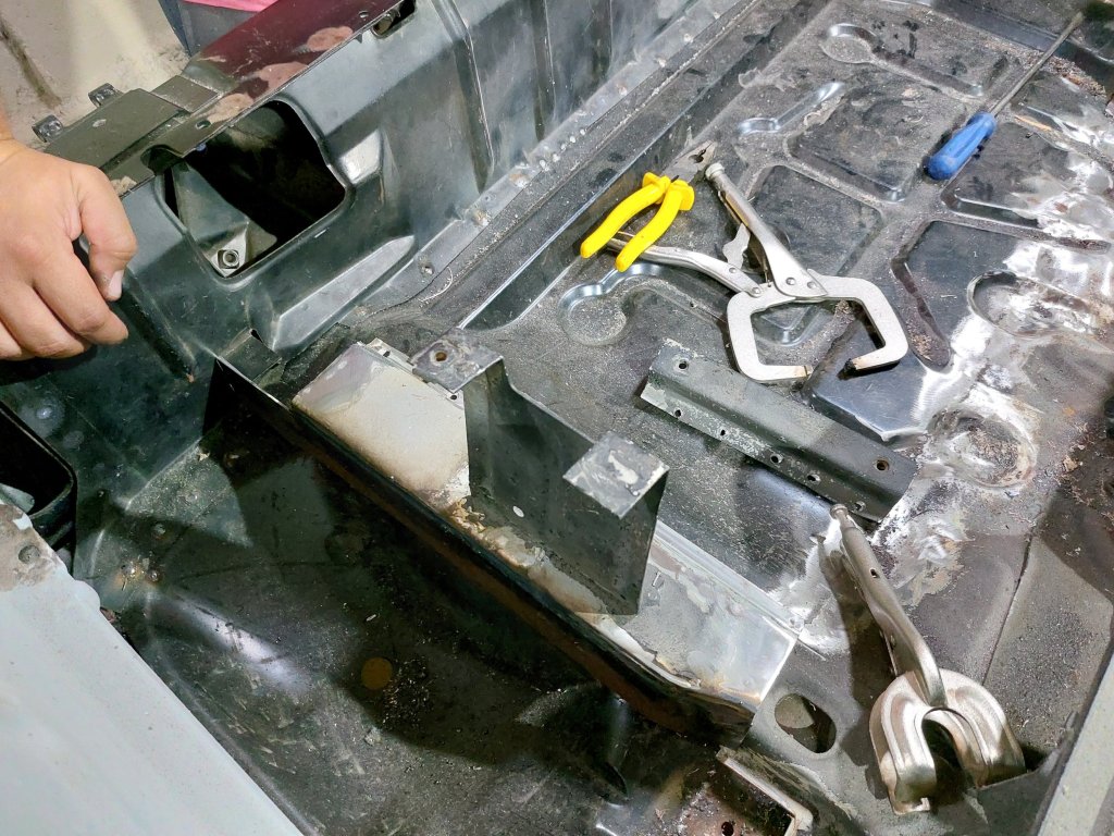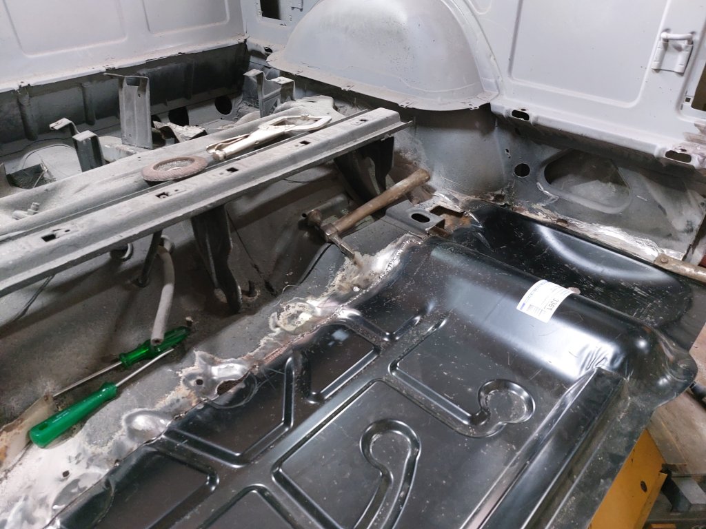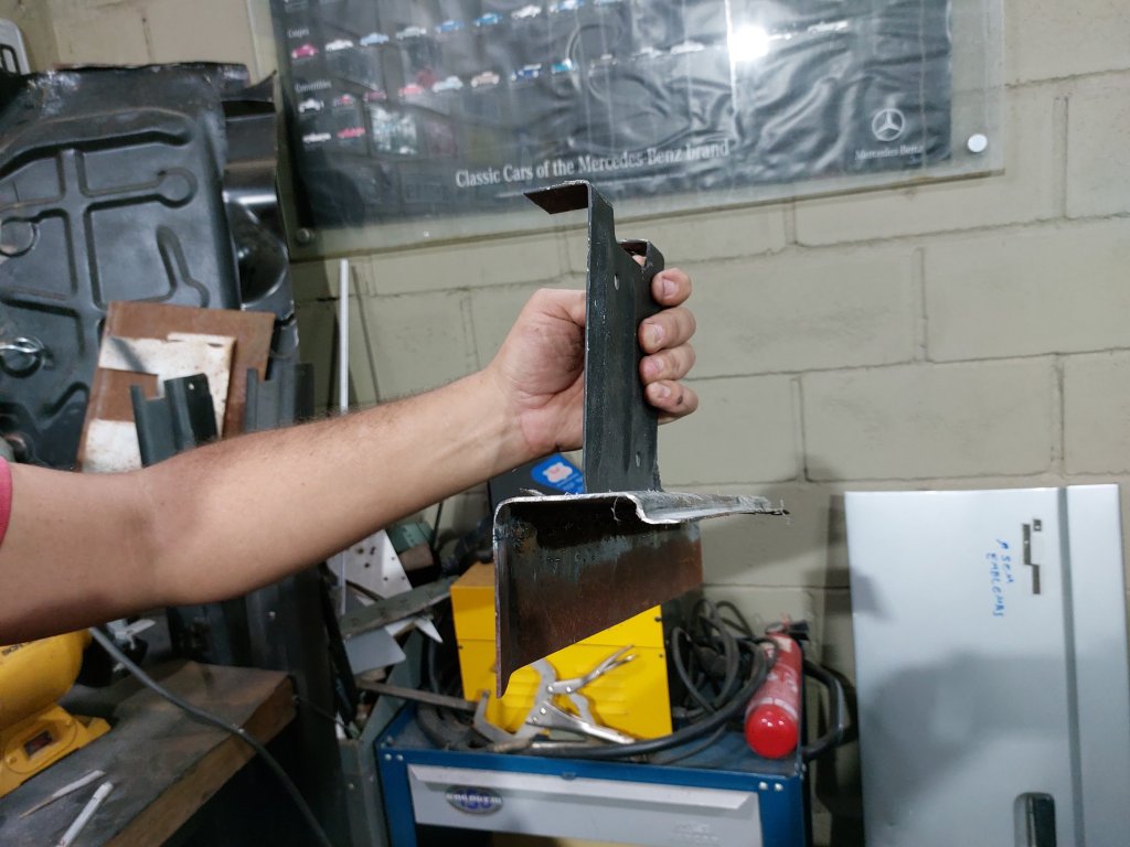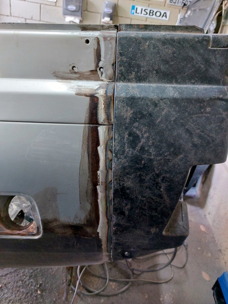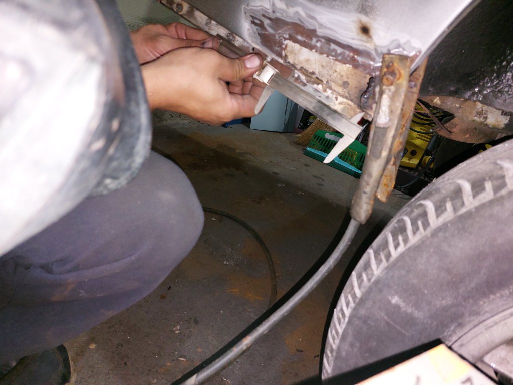 Começamos, bom….na verdade o Felipe começou trocando a parte final do assoalho, eu já havia retirado as soldas e todas as partes antigas que tinham excesso de massa de poliéster, e para ficar perfeito optamos por trocar novamente a parte final do assoalho. Eu havia soldado as chapas sobrepostas e o correto é da forma que está na foto.