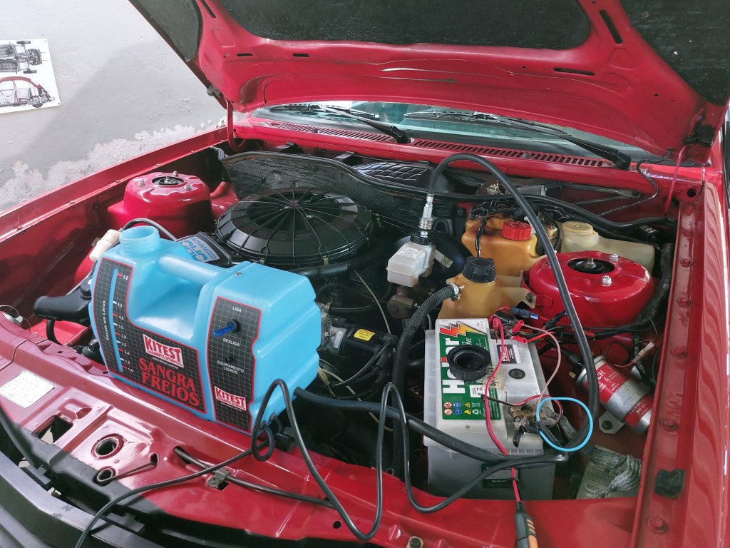 Testei e apesar dos 9 anos do fluido, indicava que tinha menos de 1% de umidade e ainda ok. Mas resolvi trocar por fluido novo dot 5. Eu sei que o original é dot 3, mas além do 5 ser melhor, a máquina “sangra freios” já estava com bastante dot 5 no reservatório e não queria desperdiçar.