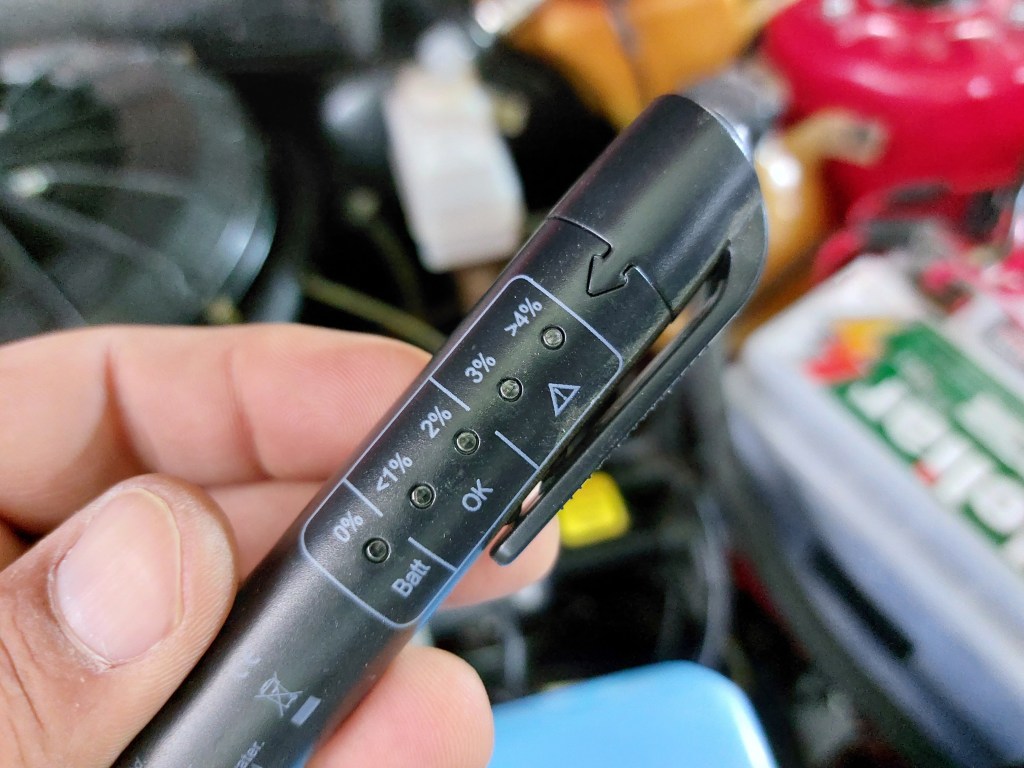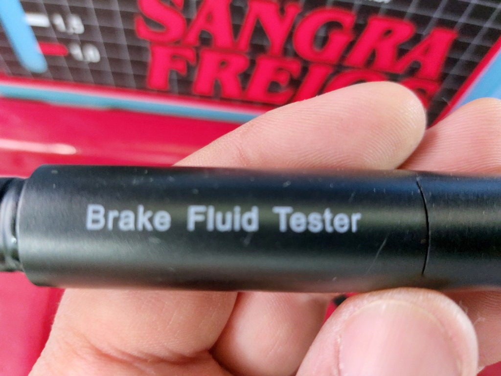 Outra troca que fiz, foi do fluido de freio, antes de trocar é possível fazer um teste bem simples, para saber se é necessária a troca, usando esta “caneta de teste”.