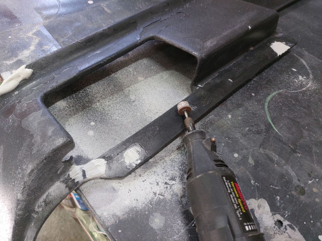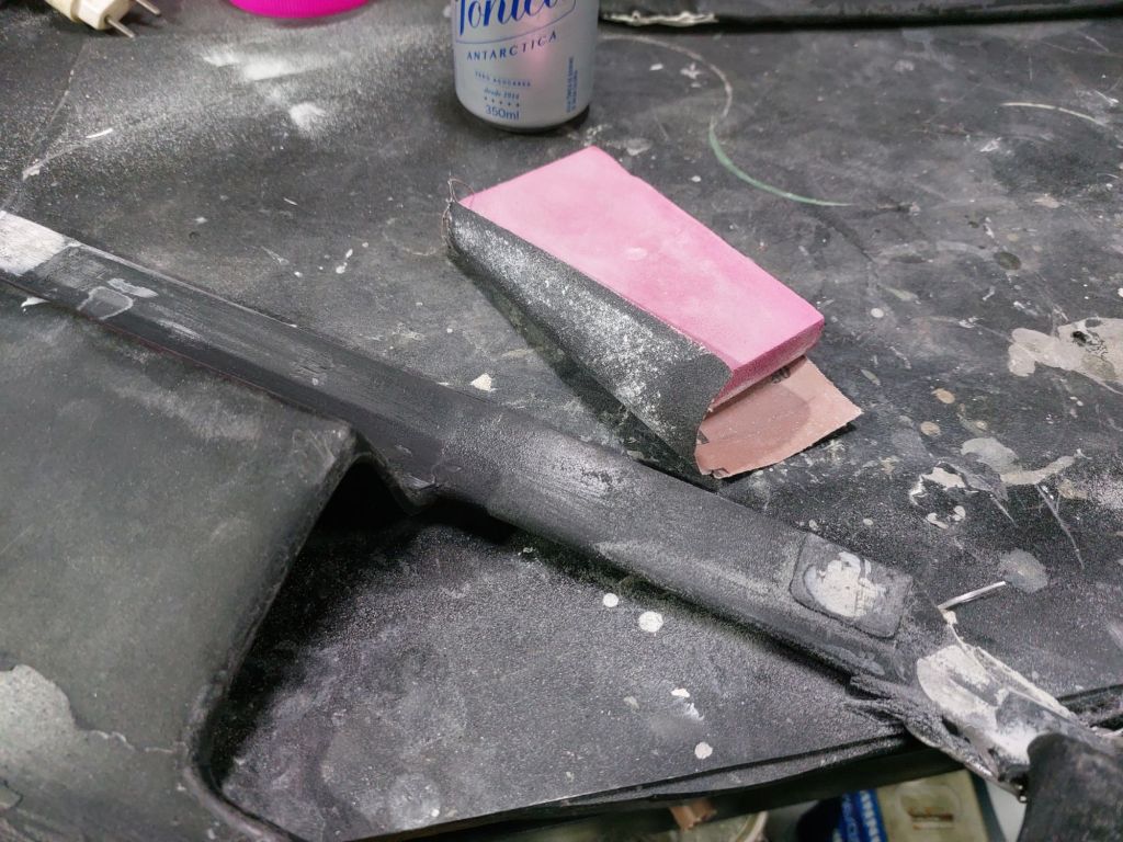 Mas…… depois de passar o primer, a tinta em spray, utilizada para algum conserto no passado reagiu. Então, vou ter que lixar tudo novamente. Mas a recuperação da peça usando a cola de parachoques funcionou.