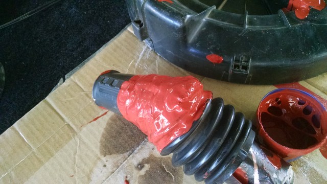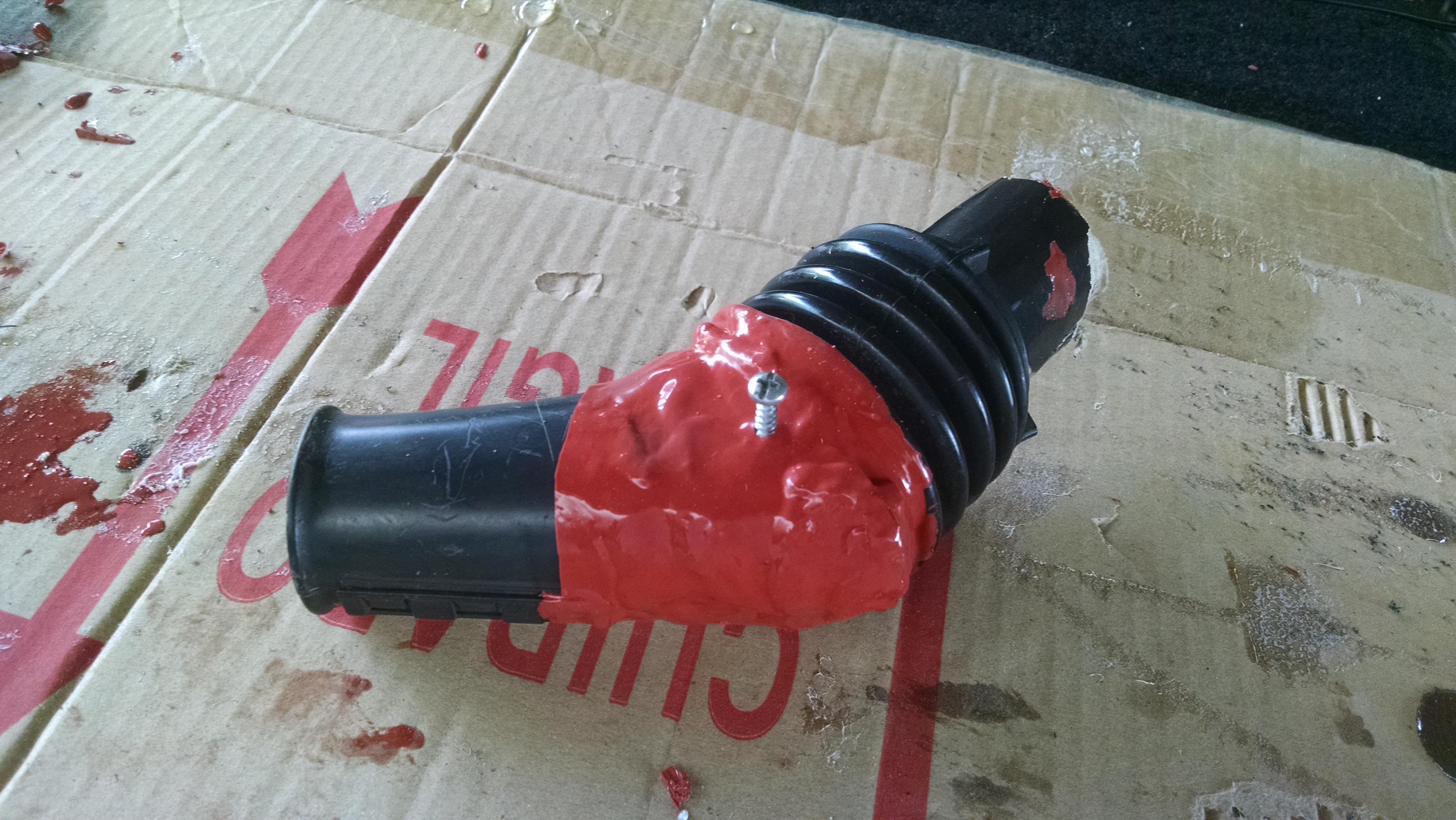 Na minha primeira tentativa, usei Borracha de silicone (da mesma forma que se faz moldes) então moldei numa mangueira flexível que eu tinha aqui na Garagem 150, assim parafusei a ponta do filtro de ar no painel frontal e encaixei no filtro de ar cortado.