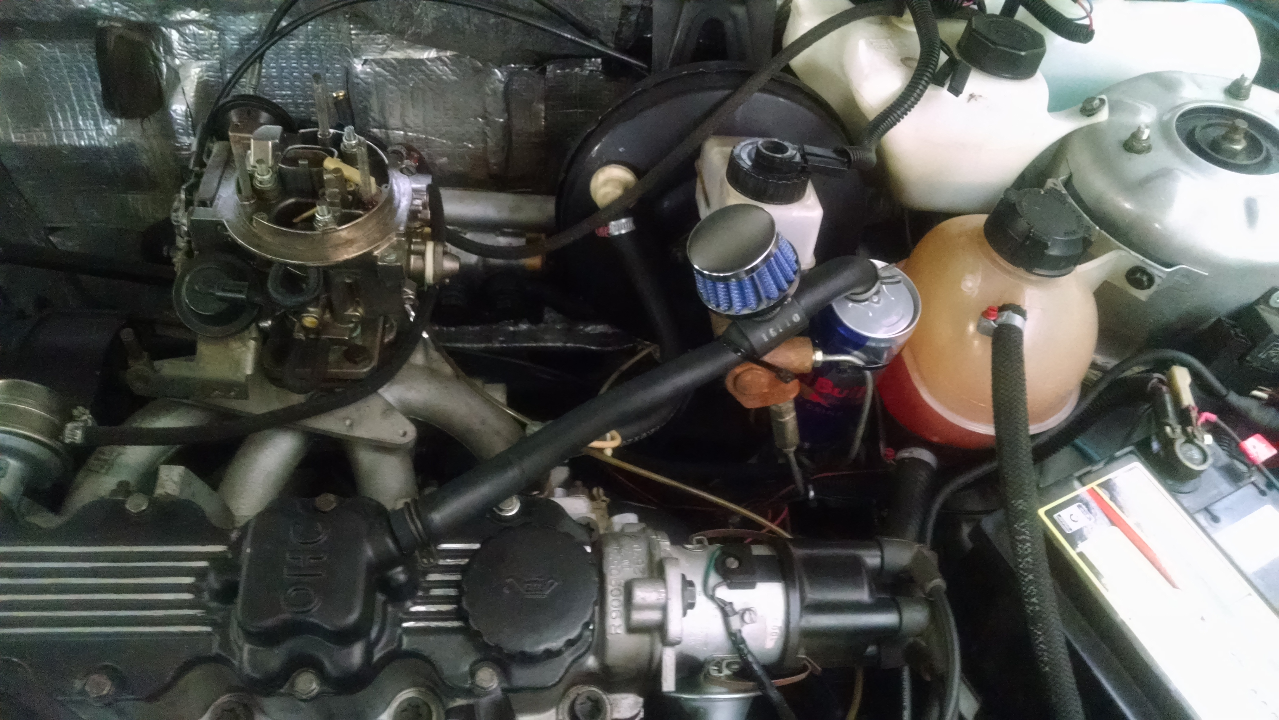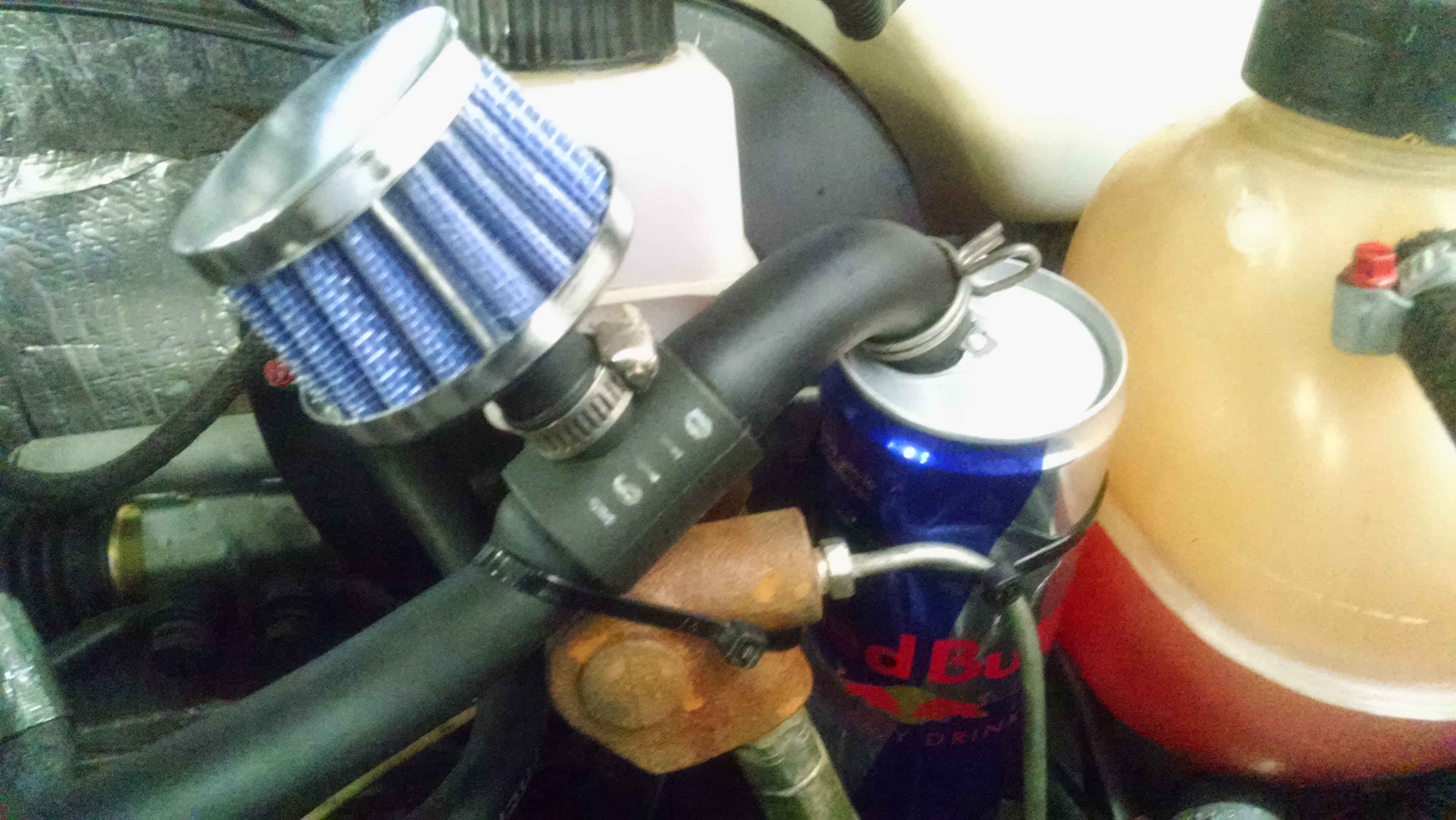 E o vapor de óleo, simplesmente usei uma latinha para coletar o excesso e um filtro antes, para o vapor sair limpo para o ambiente. Vou avaliar quanto tempo demora pra encher essa latinha, talvez precise mudar para algo mais prático e definitivo, mas já andei bastante (1.000 km) e não encheu, talvez porque o motor tem apenas 6.000km depois de recondicionado.