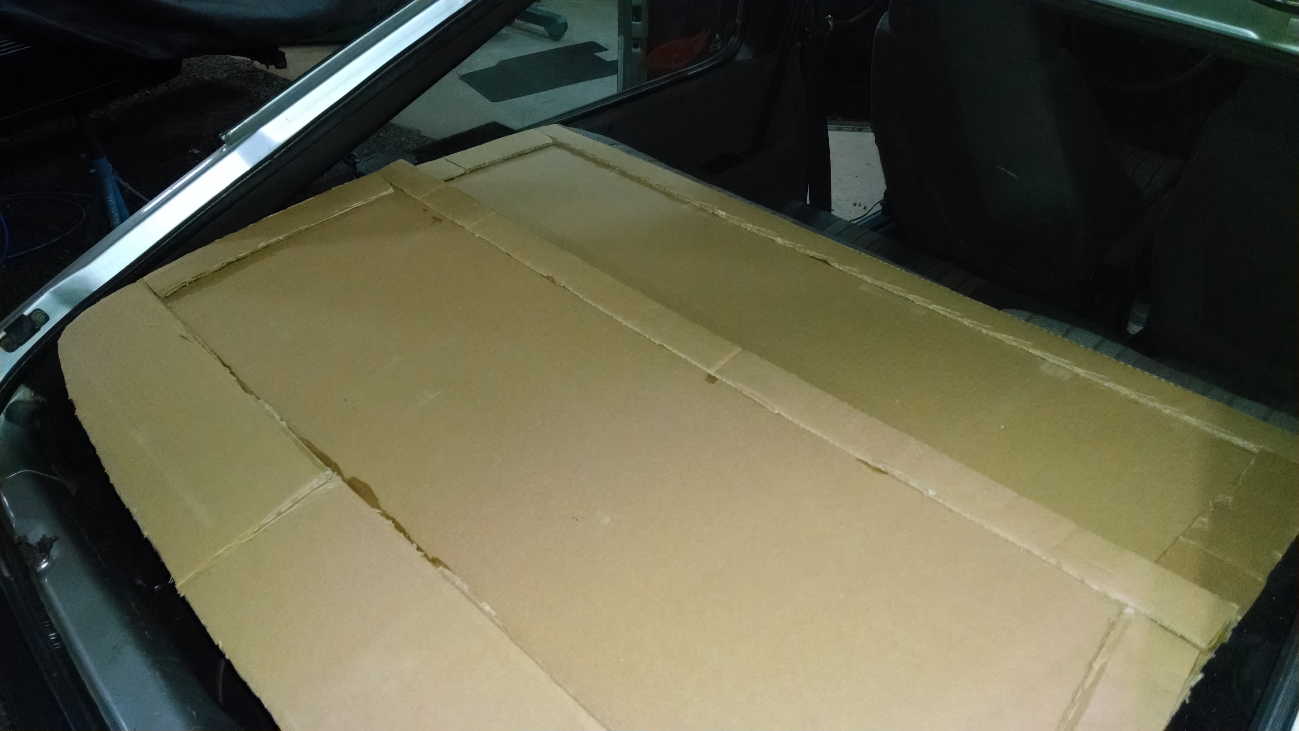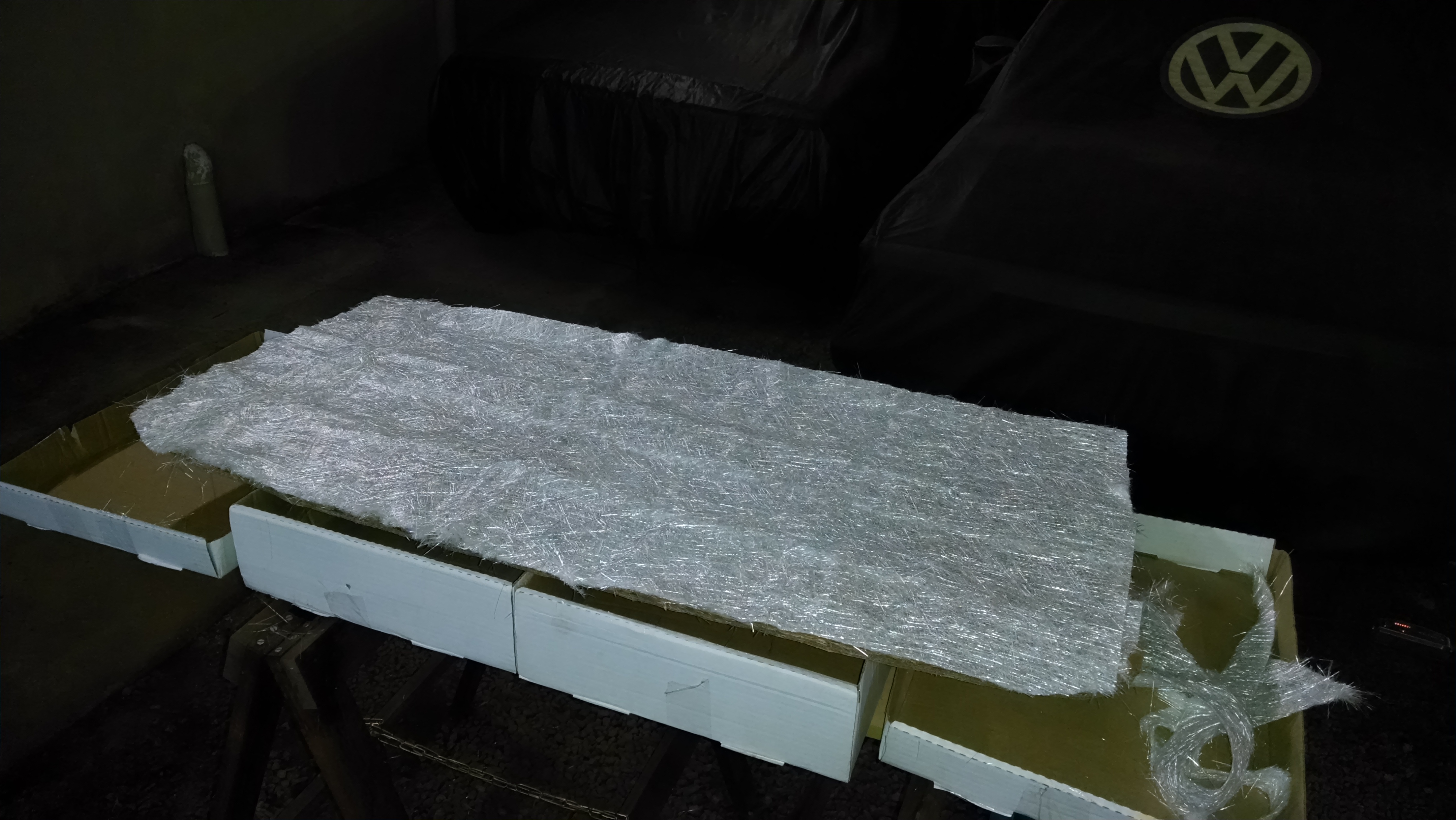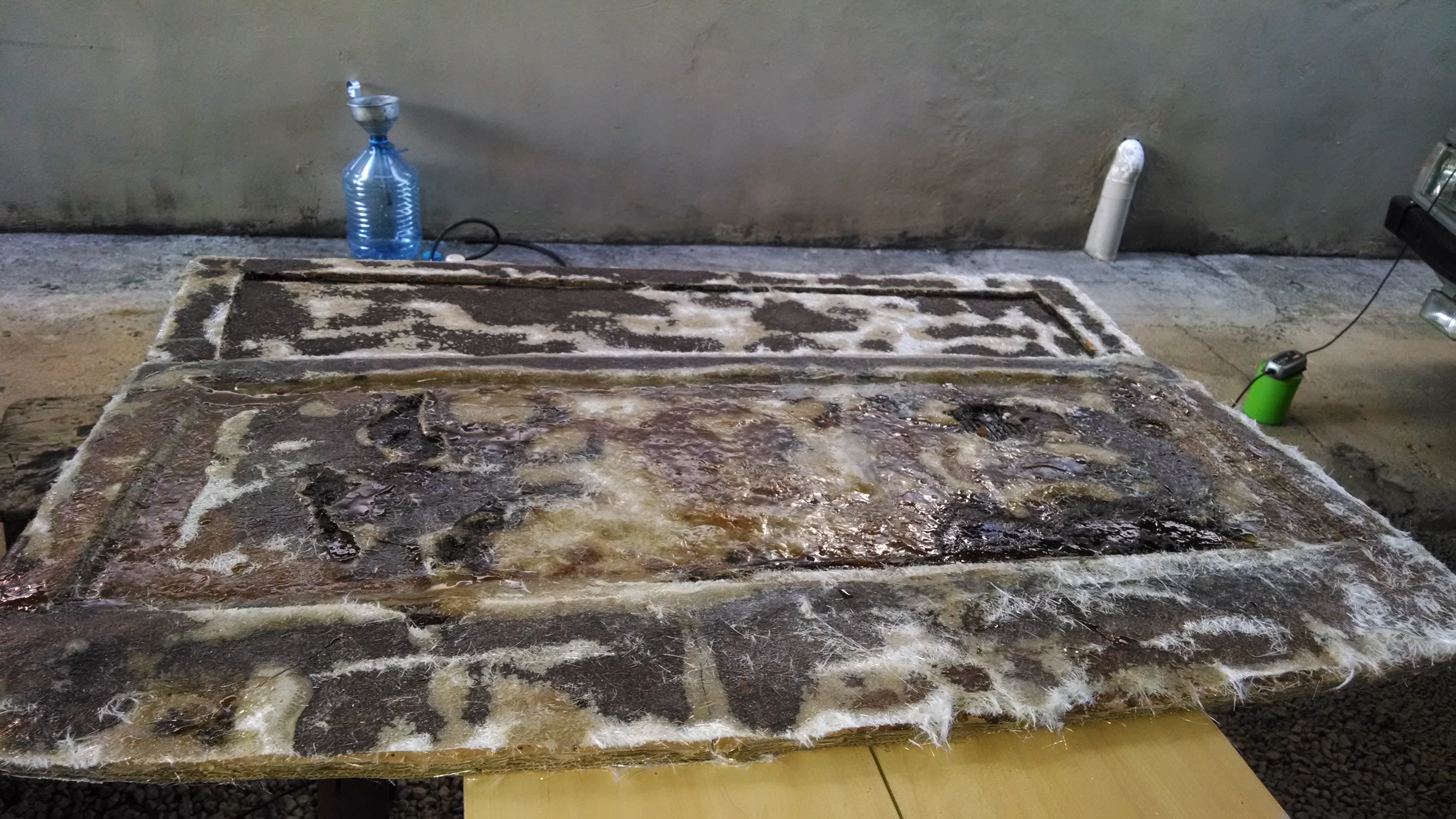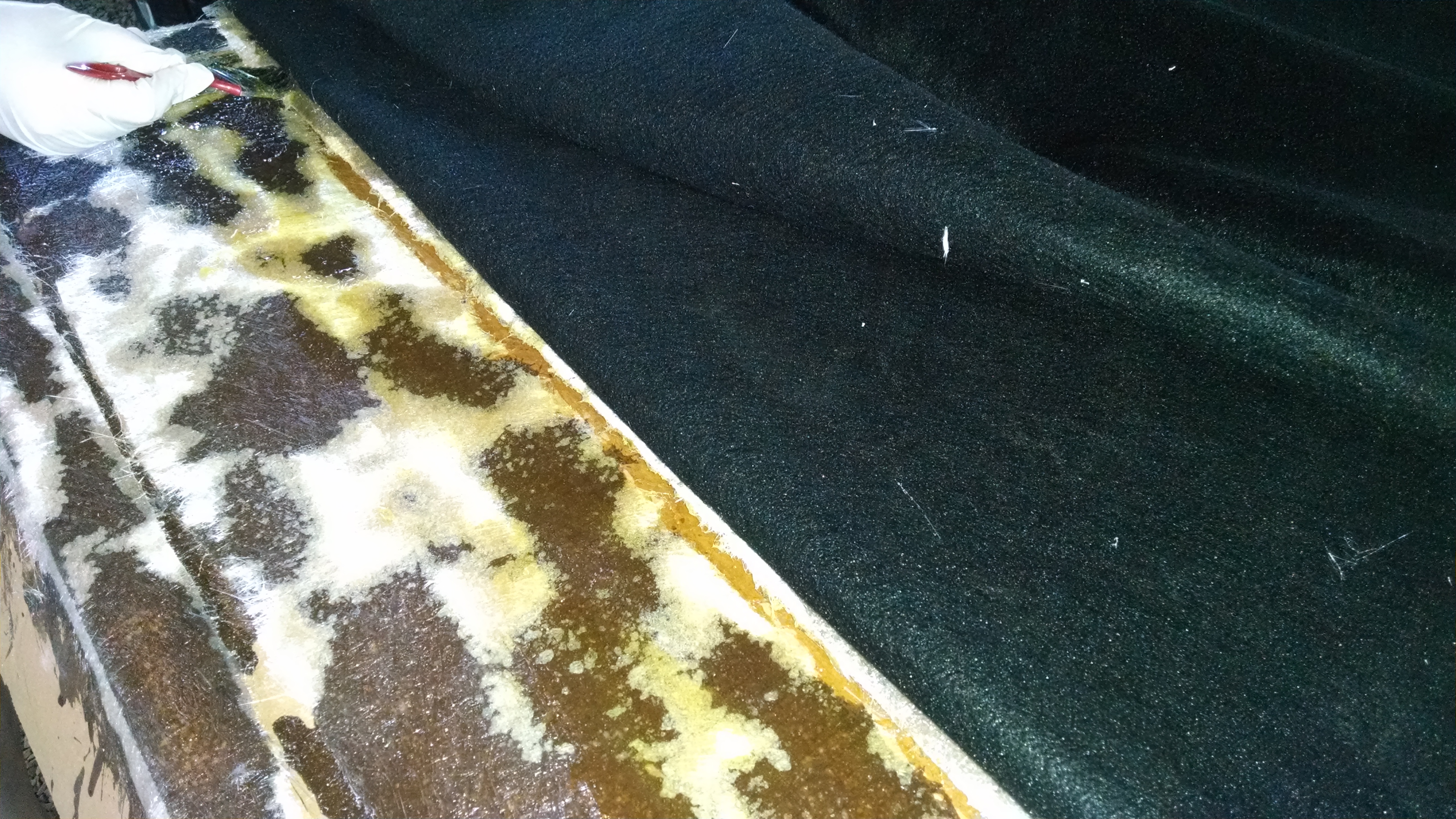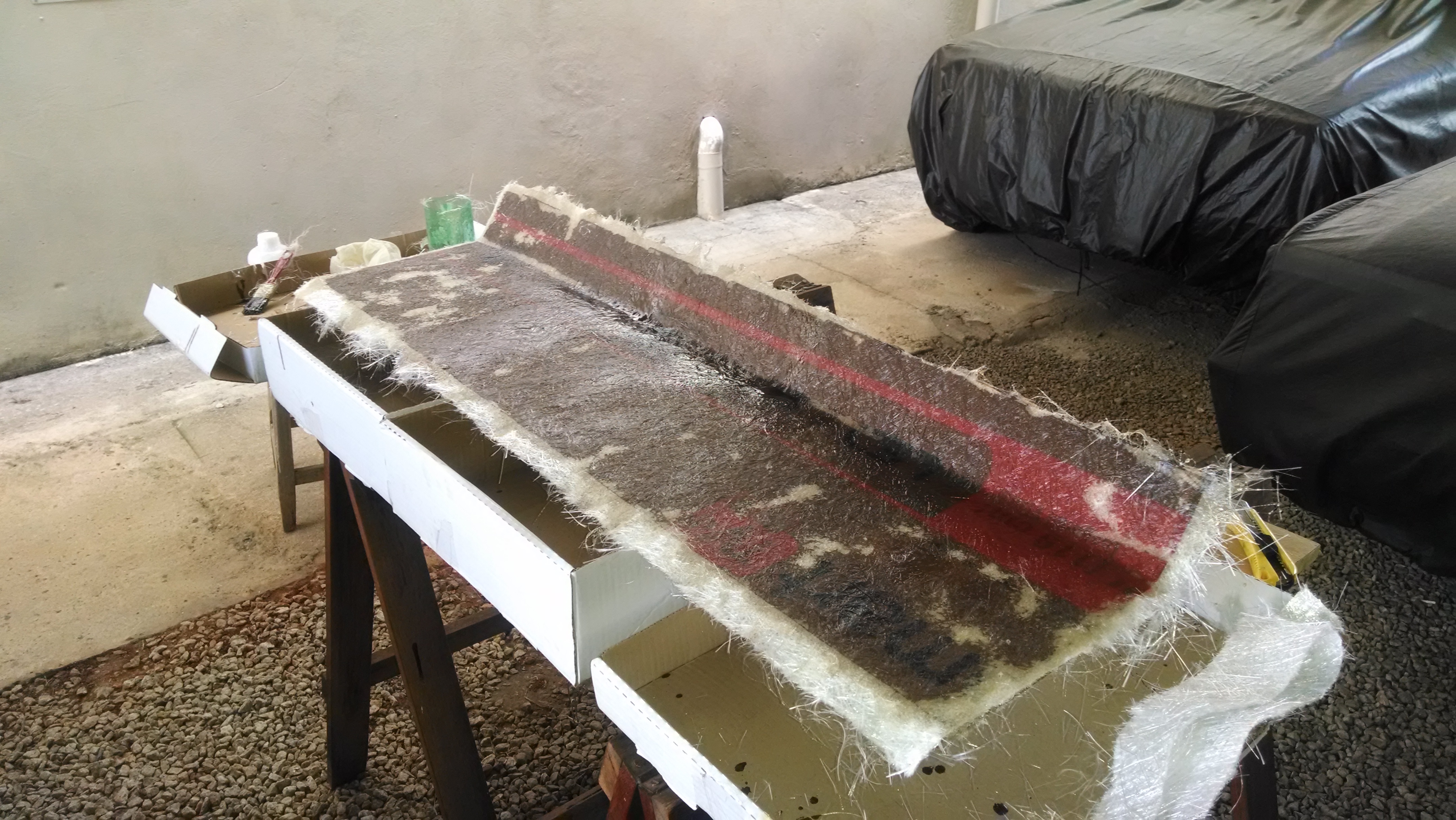 2º passo : Passe a resina/endurecedor (50%) no papelão e usando luvas “cole” algumas camadas do tecido de fibra de carbono por todo papelão;