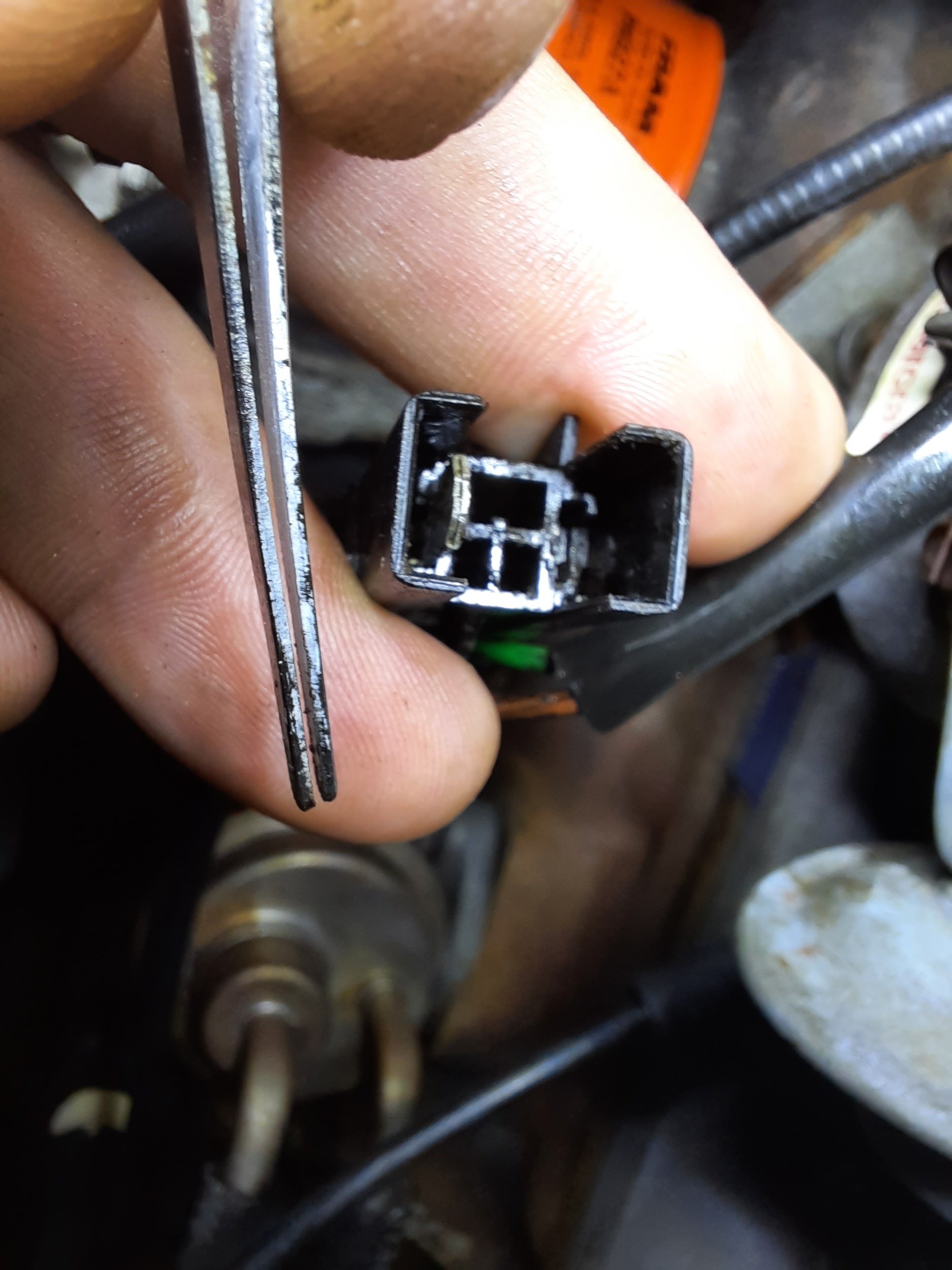 Então tive que soldar o fio no conector original, pois a Ford usava um padrão que não é o Faston, embora seja bem parecido, veja nas fotos abaixo como eu fiz.